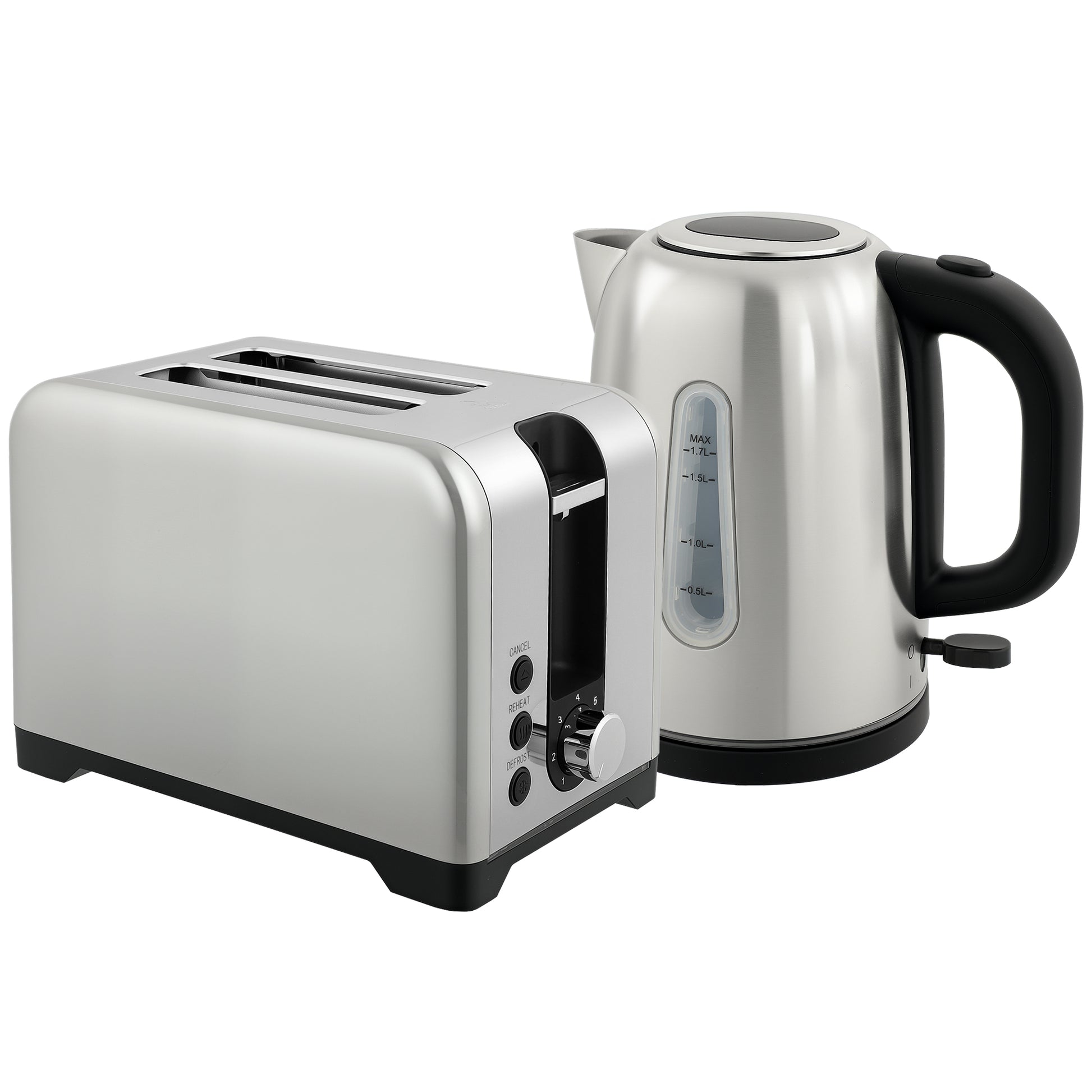 Sleek style for the countertop, with this HOMCOM toaster and kettle set. In silver tone, with polished metal accents - a simple design which complements your current small appliances. The LED strip glows for a touch of ambience when working. The 1.7L kettle capacity boils enough for seven cups; with an Otter thermostat to deliver fast and precise boiling with safety features. And thanks to the seven browning levels on the two-slice toaster, it's easy to enjoy your food your way.