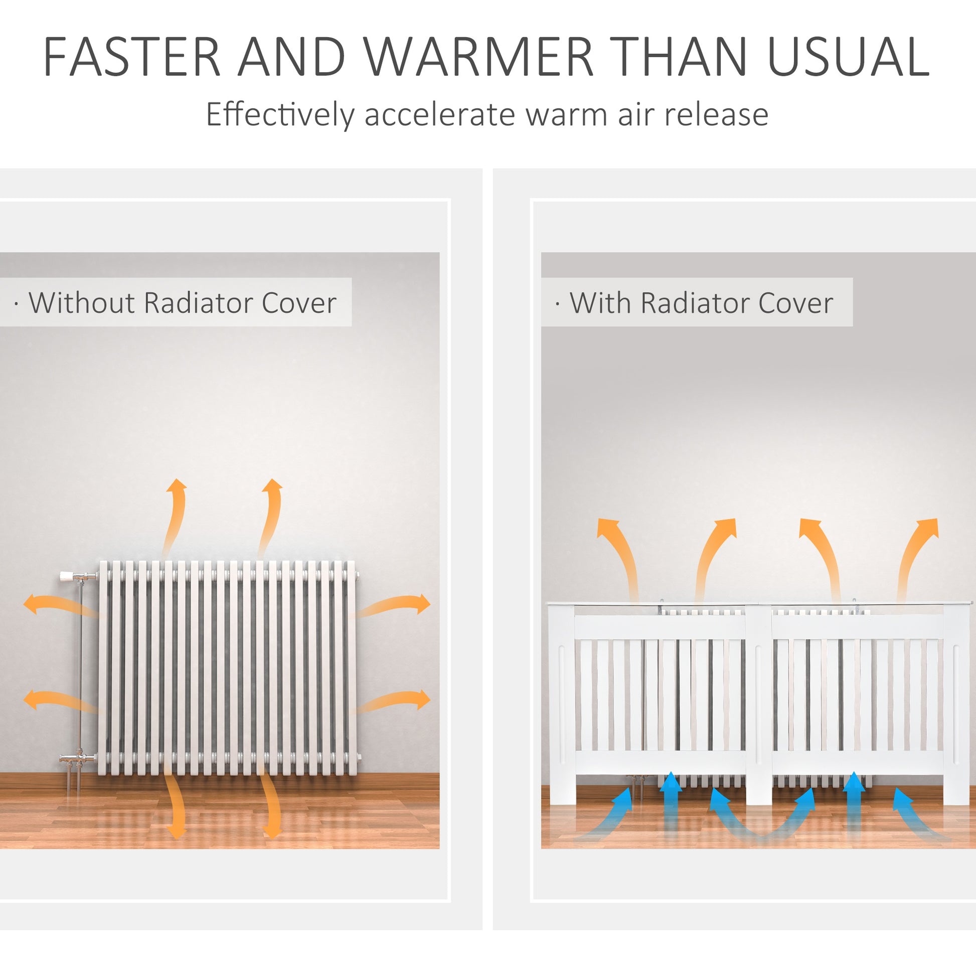 This radiator cover from HOMCOM is a practical addition to any home, covering your unsightly radiators and give a modern feel and look with the ability to place items of decorations on top. Made from MDF board with excellent craftsmanship in natural wood colour, it is designed to perfectly blend into most home decors. The front slatted design ensures that radiator heat efficiently and helps prevent children or pets from accidental contact with hot radiator surface. It comes complete with all necessary fixings to install and mount. A stylish and functional addition to your living room, hallway, office and more.