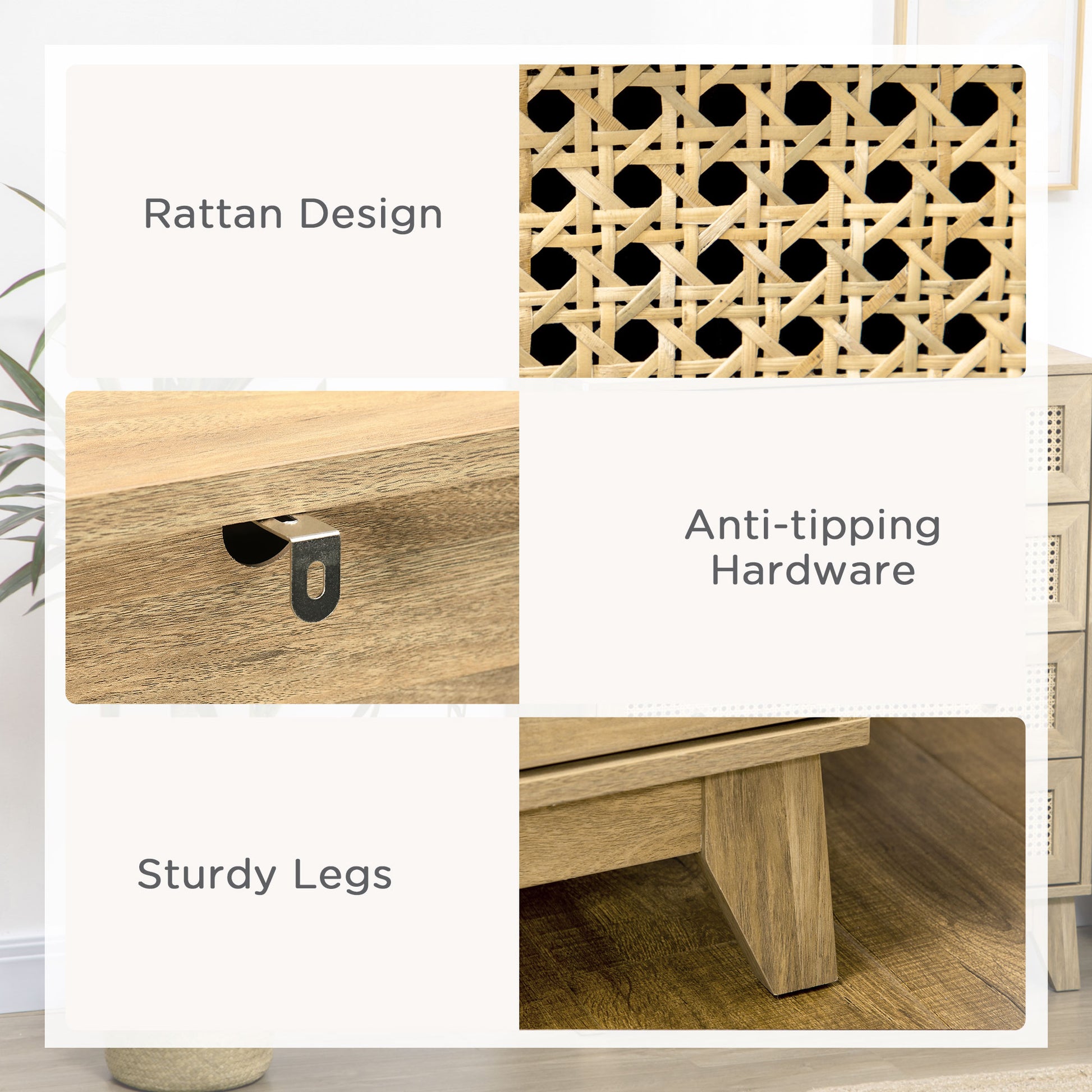 Storage Cabinet, 4-Drawer Unit with Rattan Element for Bedroom, Living Room, 80cmx35cmx95cm, Wood Effect