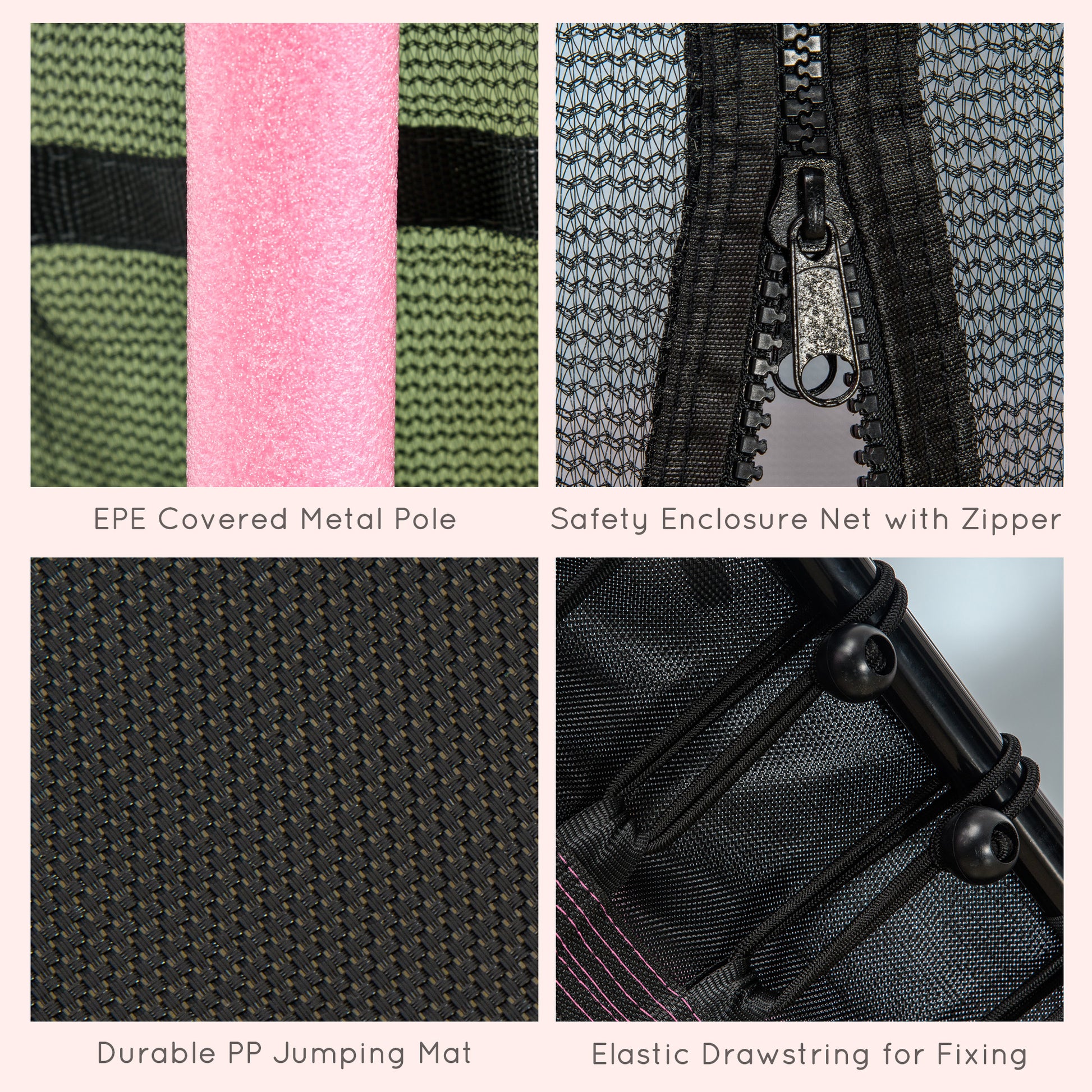 - A safety enclosure and padded poles to keep kids secure on the trampoline
