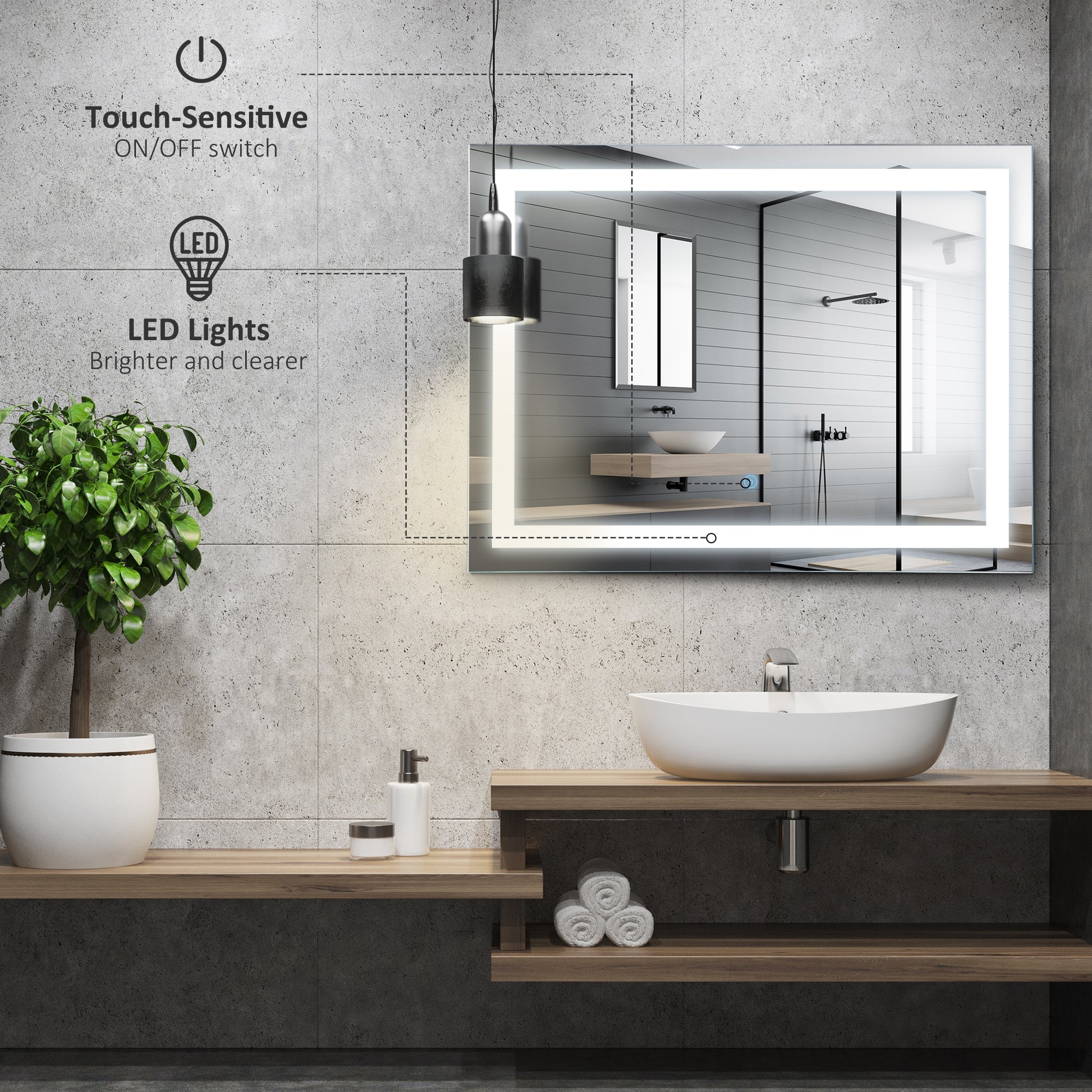 Bring contemporary style and soft illuminating light to your bathroom with this light up mirror from kleankin. A large 80x60cm design, it is made with a touch-sensitive switch to turn the light on and off easily. The illumination is soft yet strong, giving you plenty of room to see your reflection without it being too harsh upon your face. Energy efficient to cut down on electricity usage, the frame is waterproof so it is suitable for using in a bathroom. Simple and sleek style you'll love putting to use everyday.