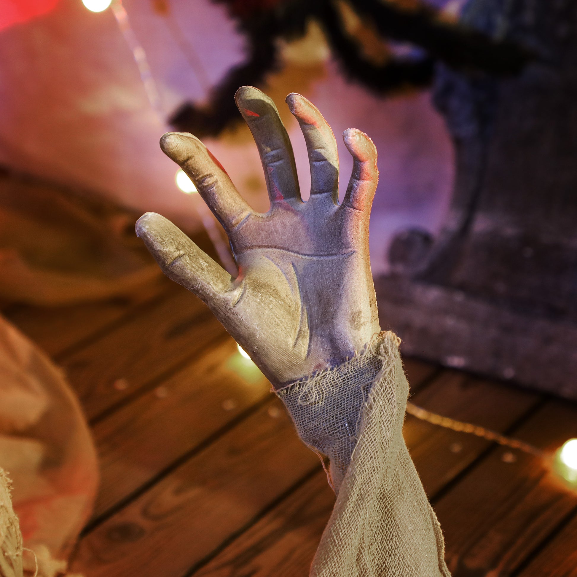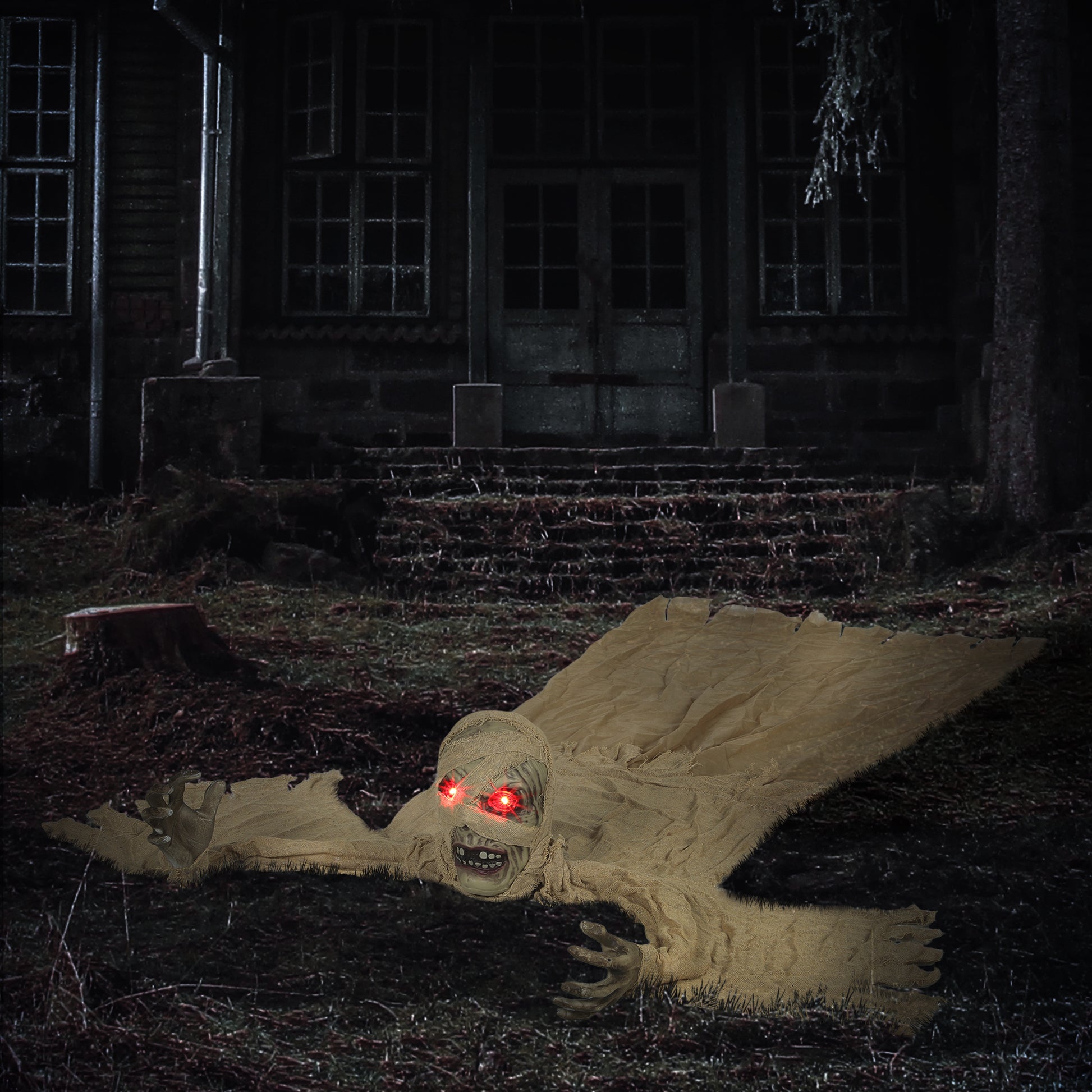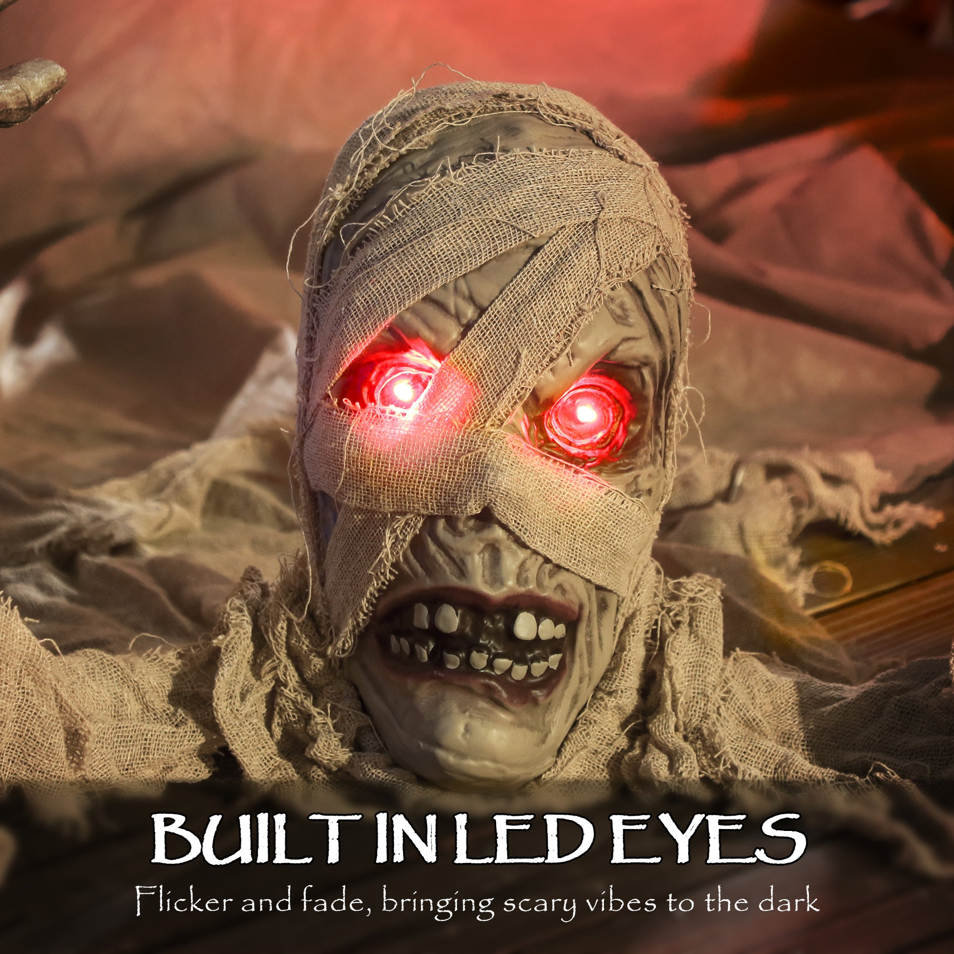 - Life-size mummy crawls forward, enhancing spooky Halloween atmosphere