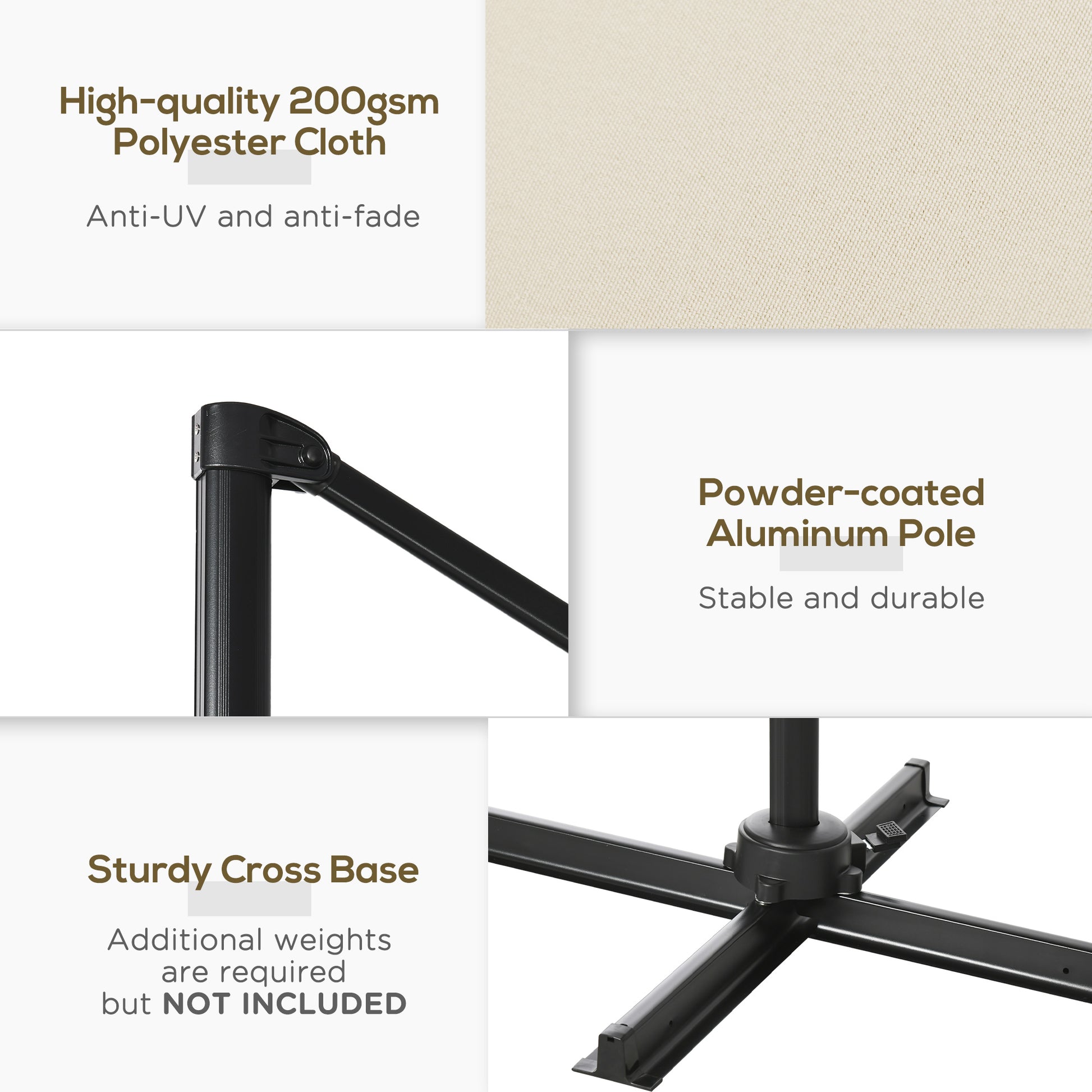 Ensure you keep yourself protected enjoying the sun, thanks to this Outsunny cantilever parasol with base included. A powder coated aluminium pole means a strong, supportive core. The polyester fabric shade keeps you protected from UV rays. It's adjustable to five positions and has a 360° movement: set it to any position you want - the must-have partner for all-day relaxing.