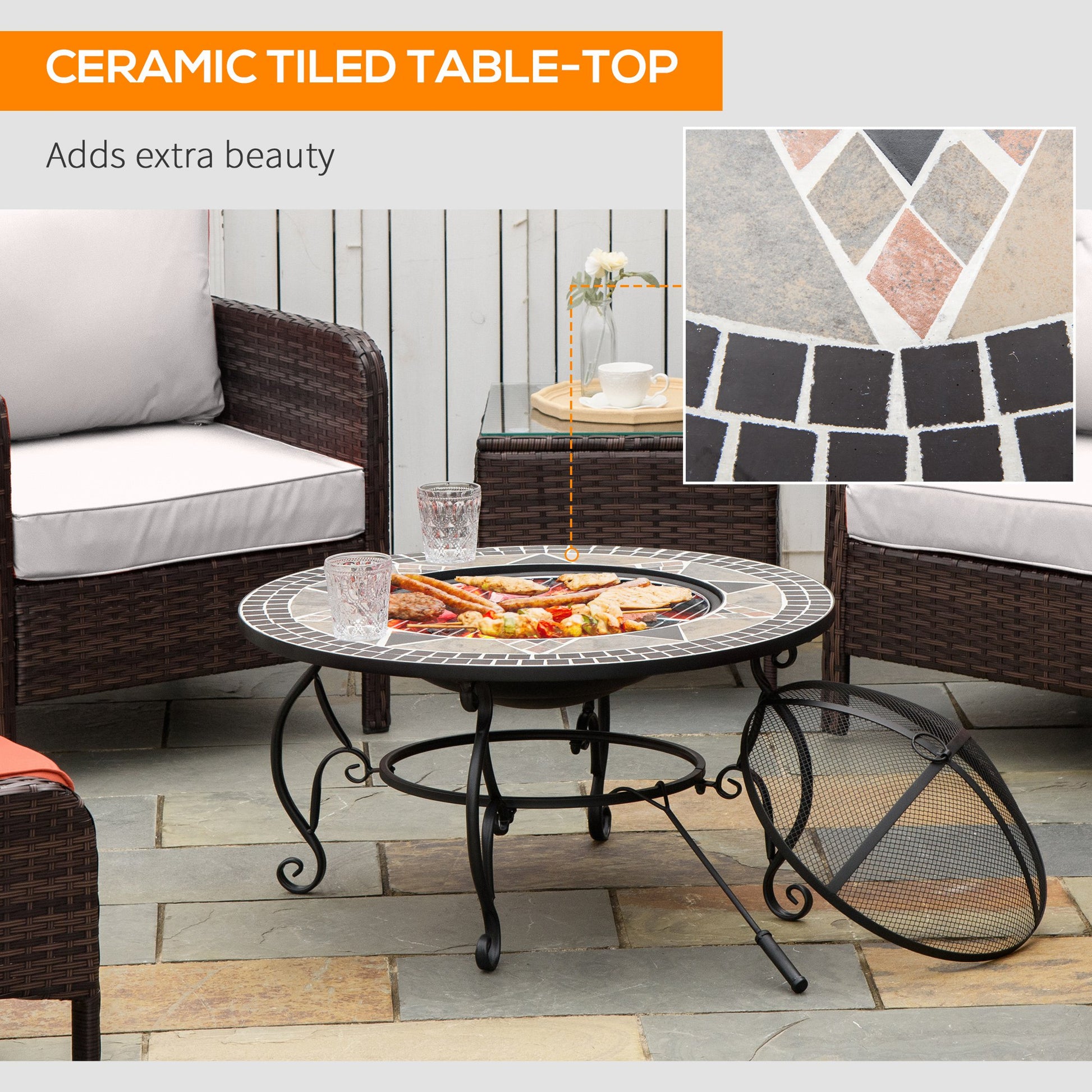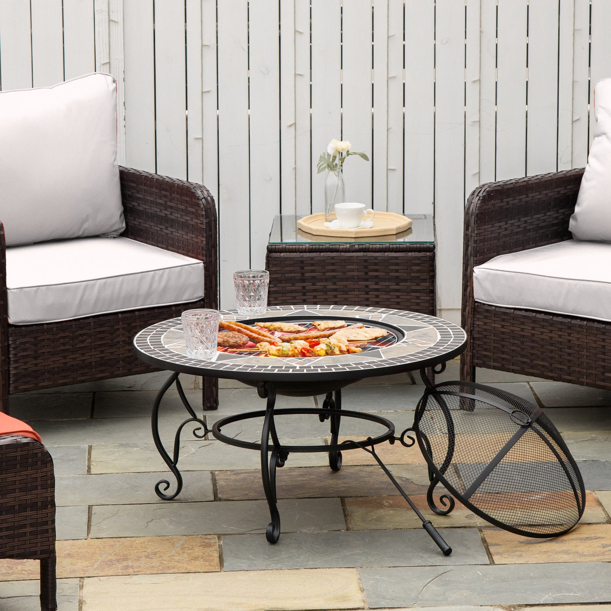A 3-in-1 design, bringing you tasty food, toasty warmth and a touch of elegance to your garden and outdoors: this BBQ fire pit table from Outsunny. A fire poker is included to safely move charcoal and other heating fuel. The mesh lid protects against flying sparks. The mosaic round outer and curved feet are pretty. Do more with the garden fire pits.