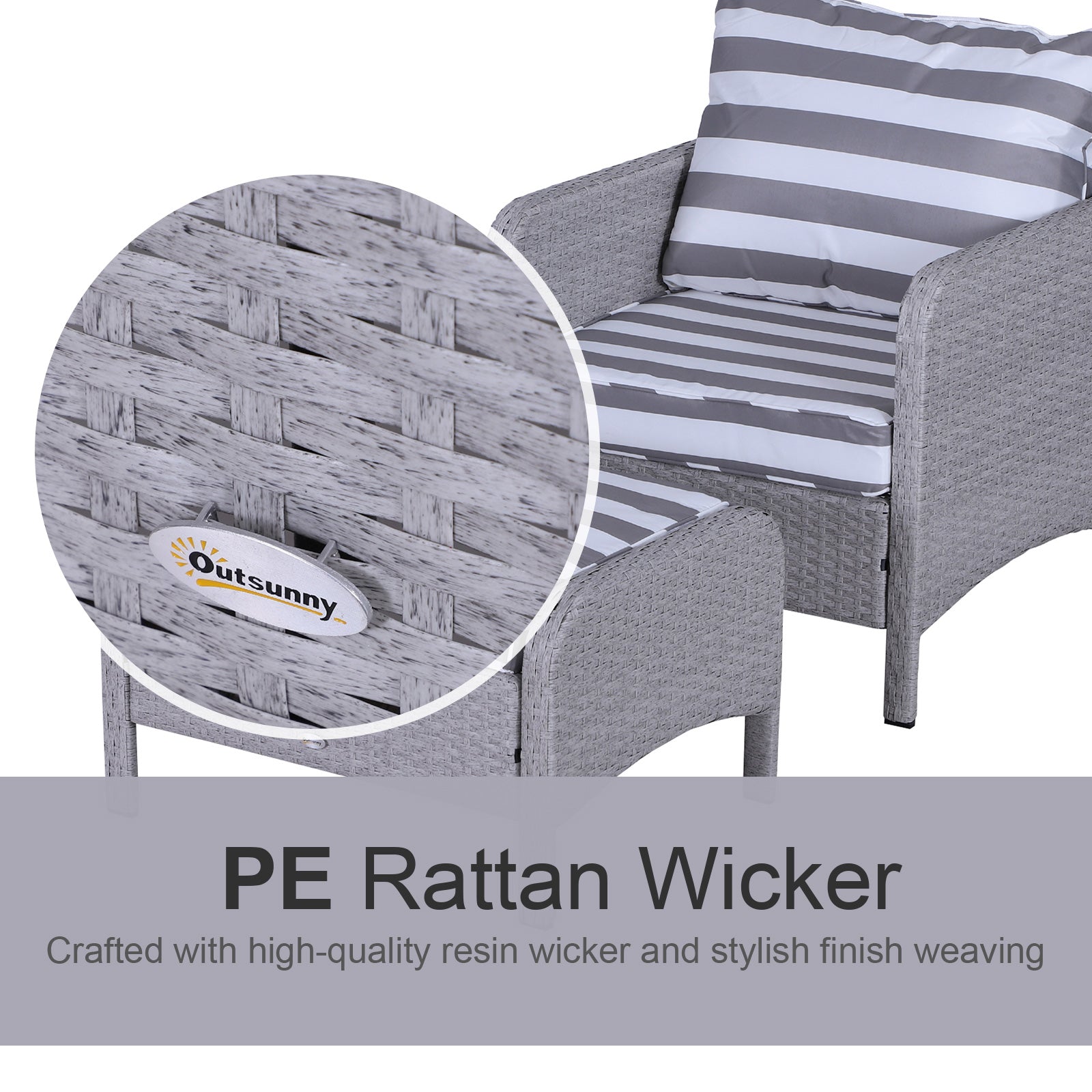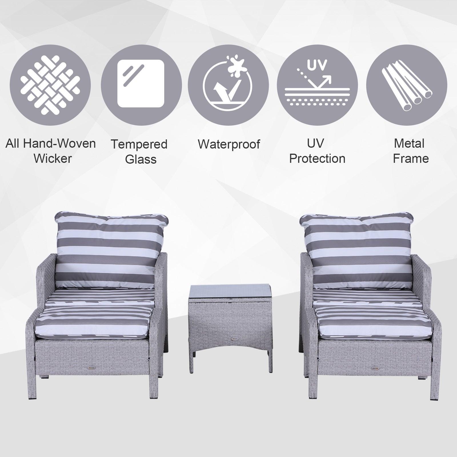 Outsunny 2 Seater PE Rattan Garden Furniture Set, 2 Armchairs 2 Stools Glass Top Table Cushions Wicker Weave Chairs Outdoor Seating - Grey