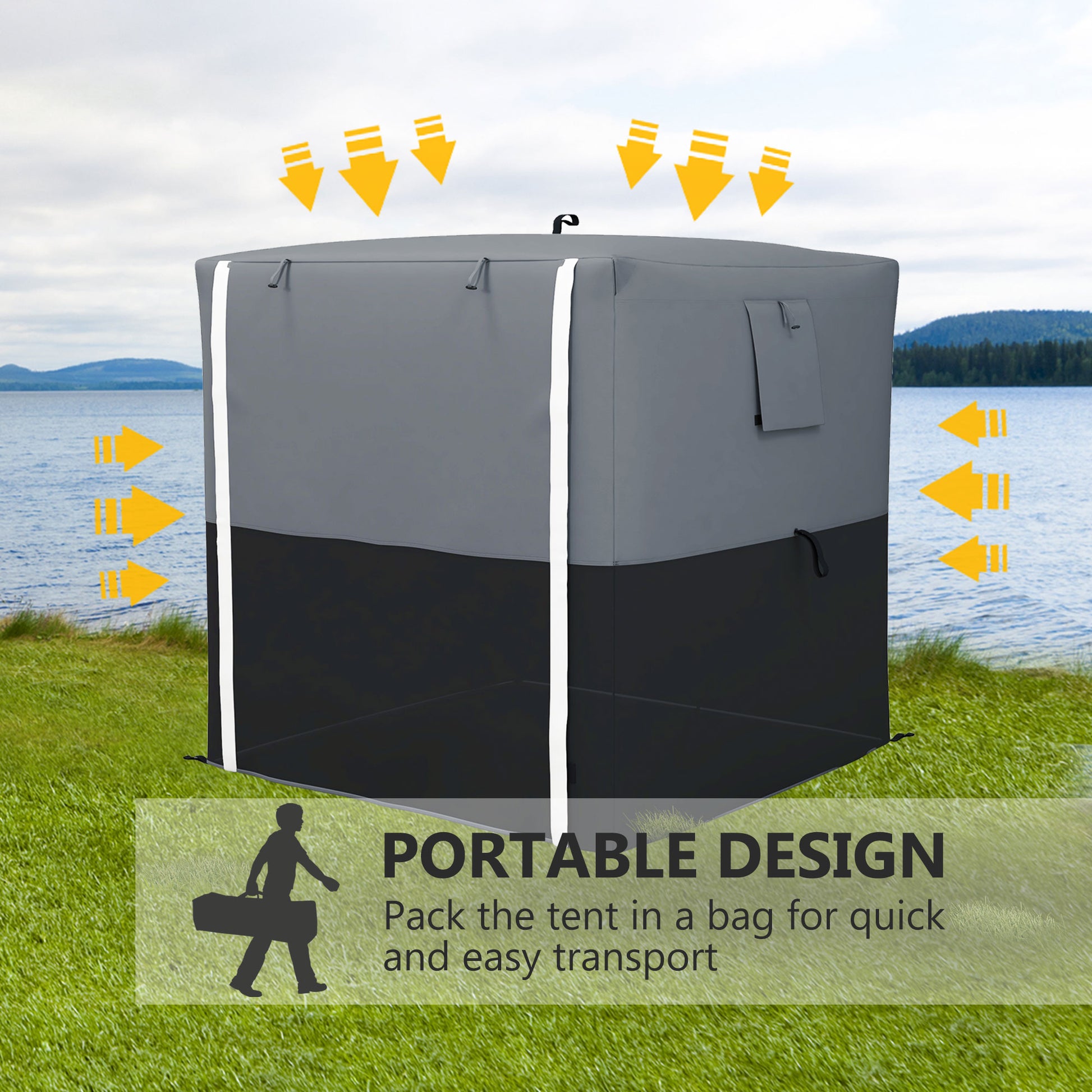 - Two mesh windows to bring fresh air and light inside, with covers for privacy when needed