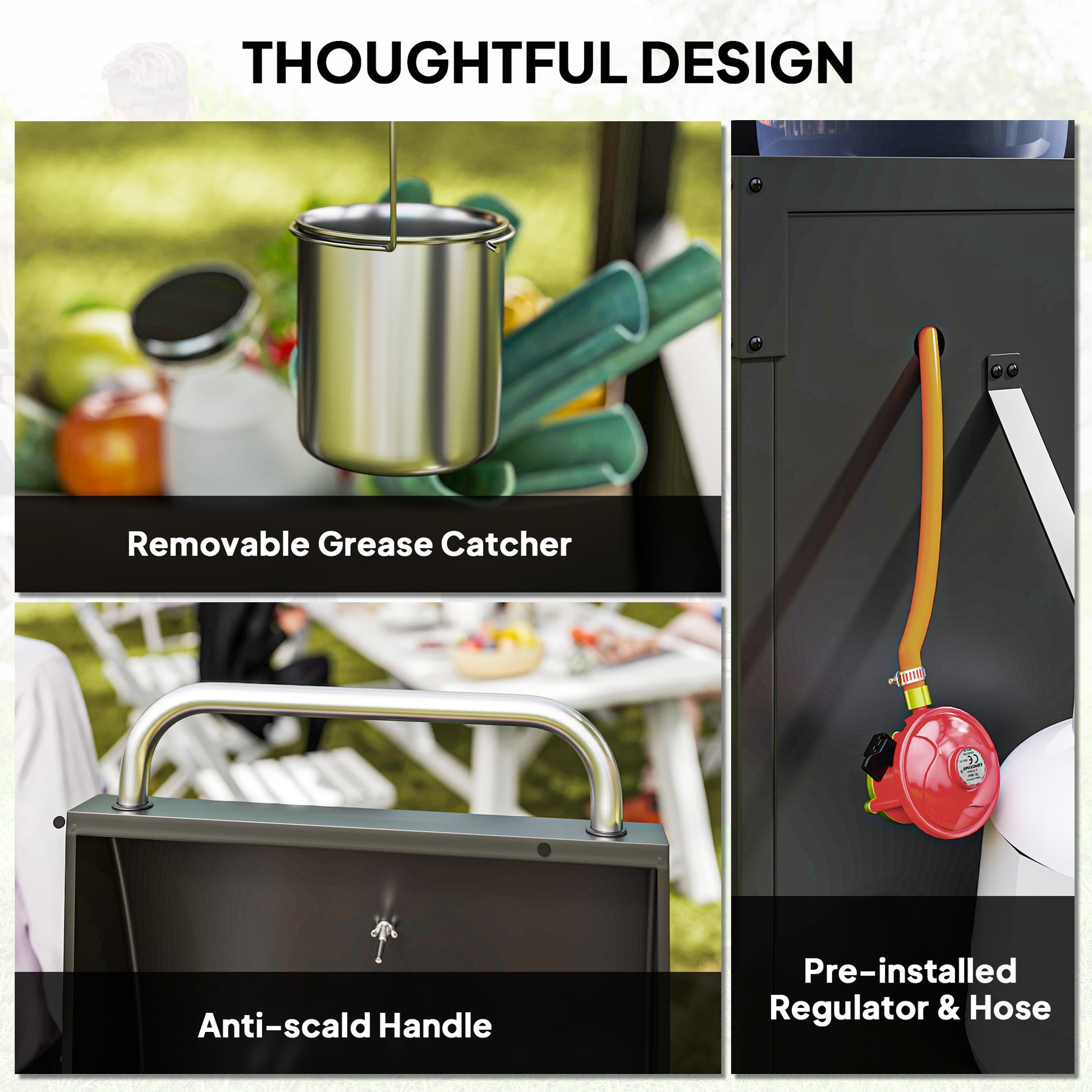 Ignite the garden BBQ with the Outsunny gas bbq with side burner! Featuring a spacious grilling area and a warming rack, you'll have plenty of space to cook up a feast. The convenient side burner keeps sauces and sides simmering while your main course sizzles to perfection. With individually ignitable and controllable burners and a built-in dual-scale thermometer, achieving grilling temperatures has never been easier!