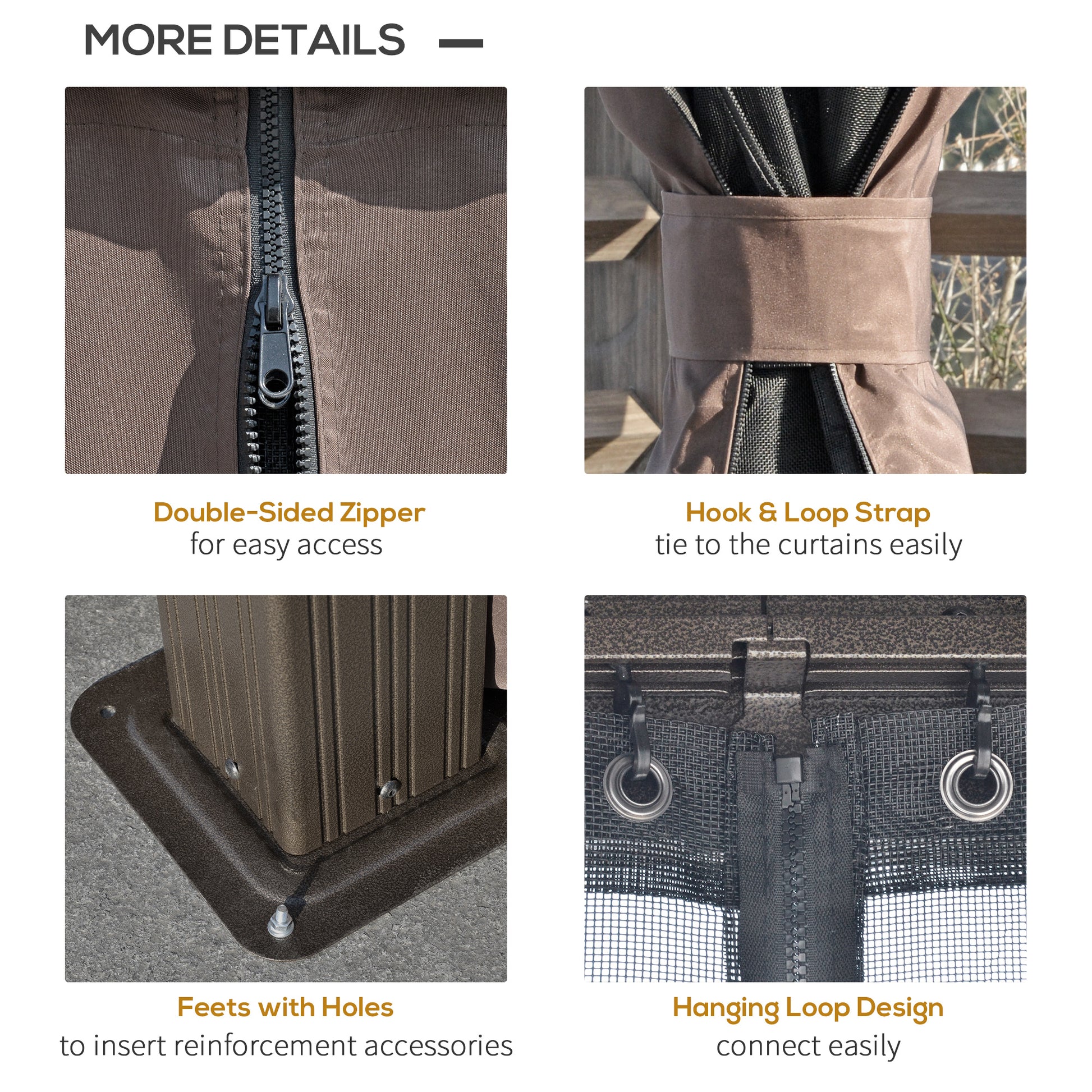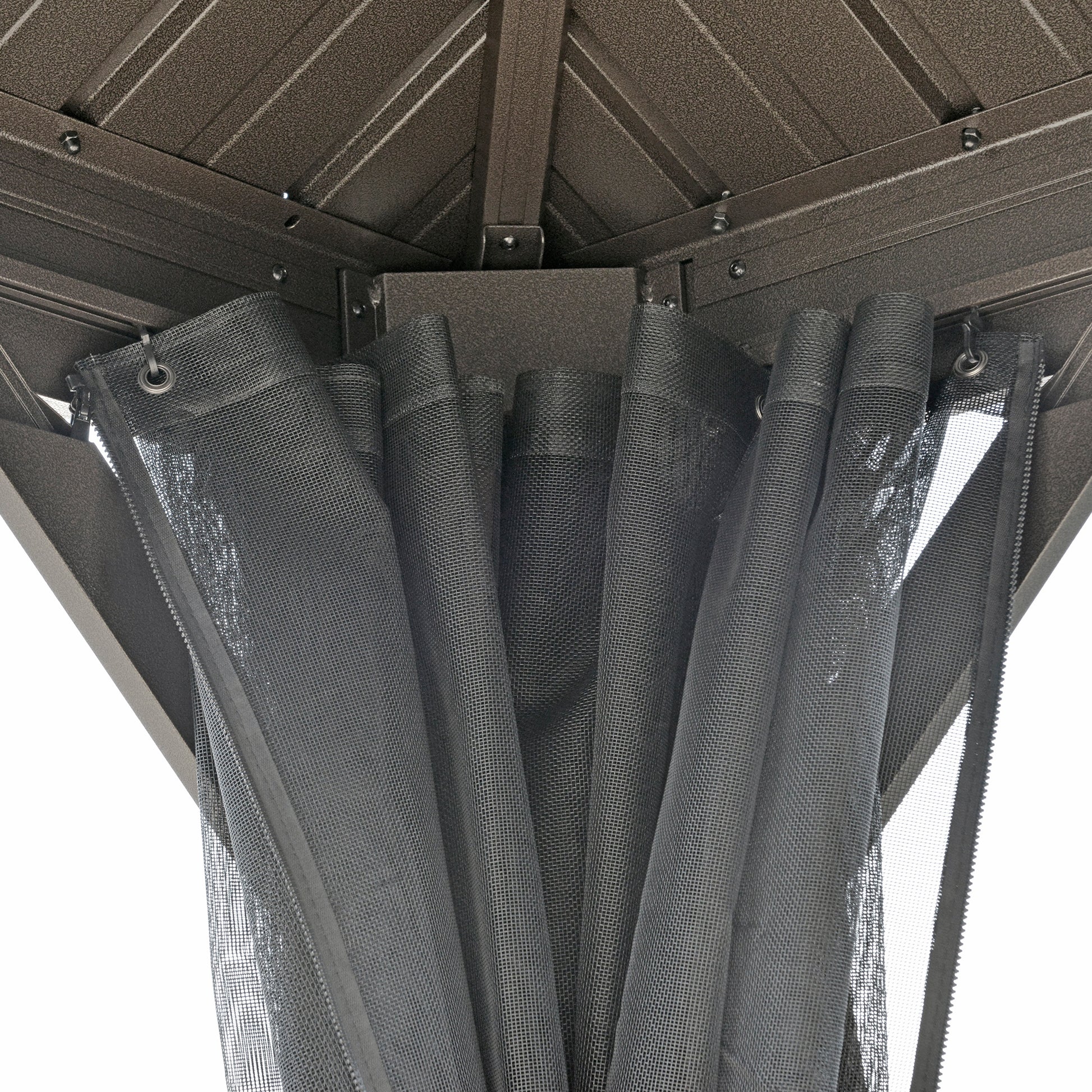 - Curtains for privacy, with mesh inner to help keep insects out. Both tie to the corners to fix into place