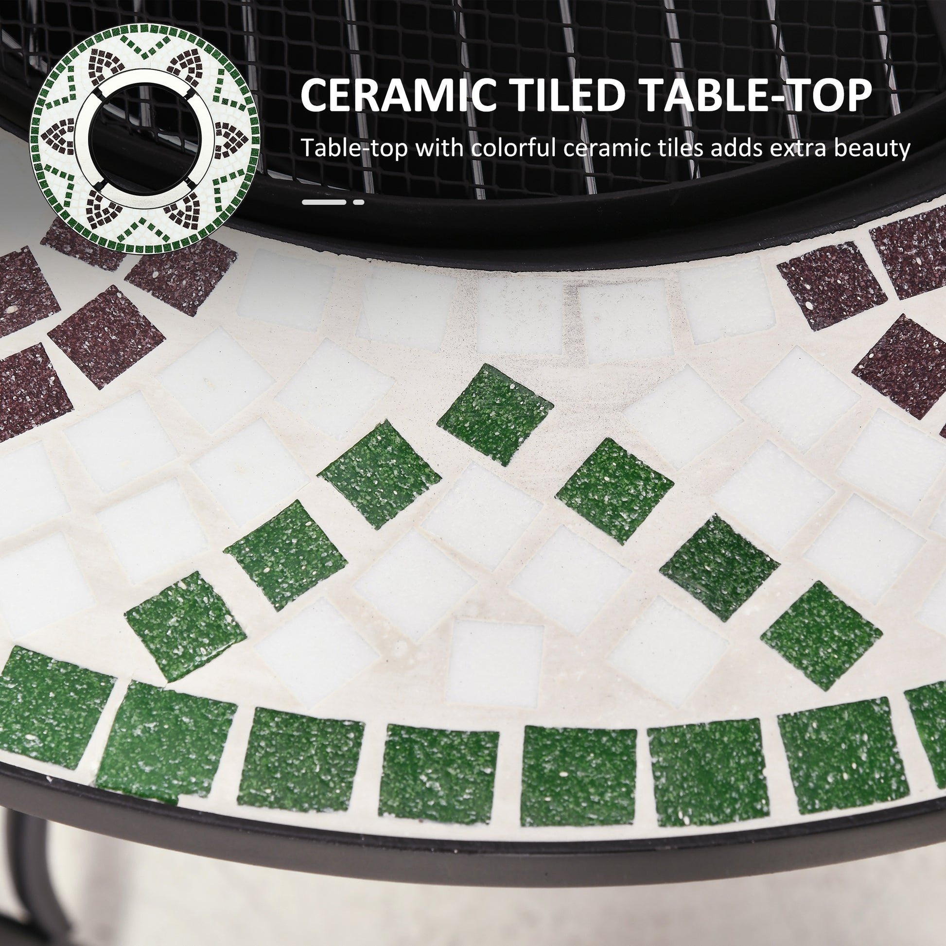 A 3-in-1 design camping fire pit, bringing you tasty food, toasty warmth and a touch of elegance to your garden and outdoors: this firepit BBQ table from Outsunny. A fire poker is included in the garden fire pits to safely move charcoal and other heating fuel. The mesh lid protects against flying sparks. The mosaic round outer is pretty. Do more with the garden fire pit.