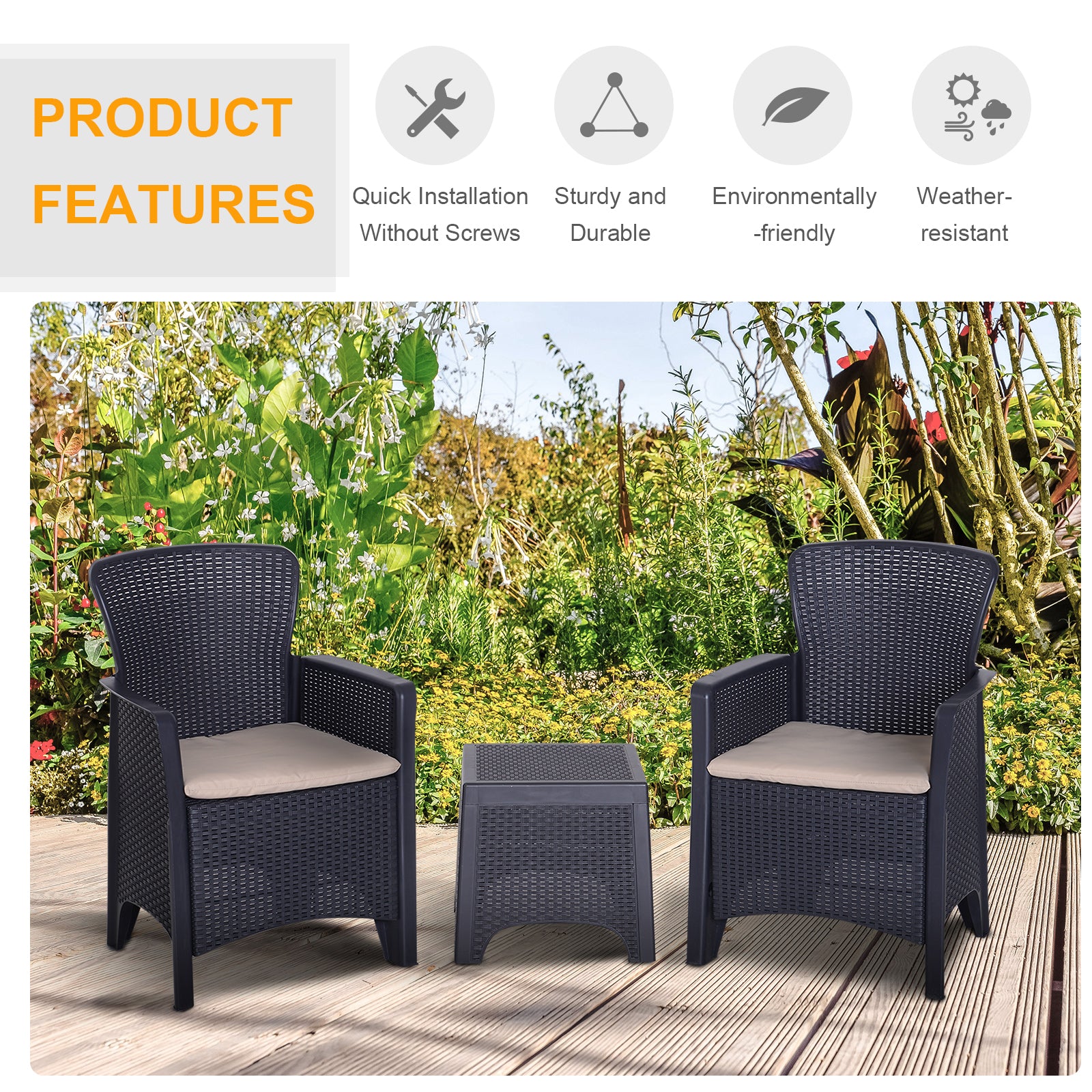 Relax stylishly and comfortably with garden bistro sets from Outsunny. Made from high quality PP material, this balcony furniture is easy to maintain and is weather-resistant, meaning that you don't need to worry about moving it indoors and outdoors weather dependant, and each piece has been made to last with you for years of use. Both seats come with thick padded cushions so you can sit down and relax for hours on end. Our patio table and chairs are the perfect excuse for inviting friends and family over!