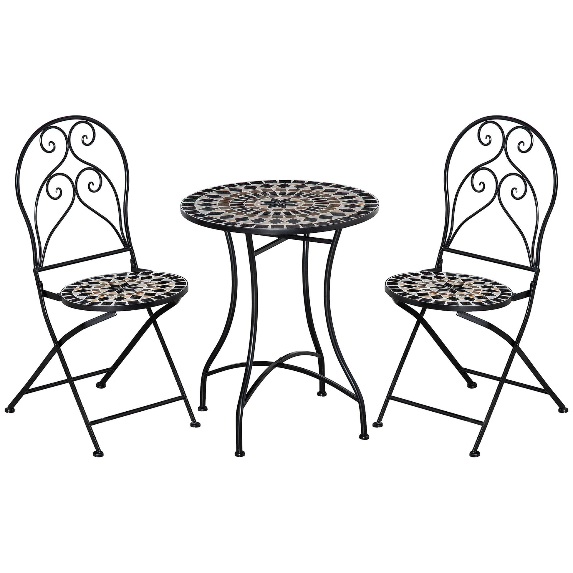 Outsunny 3 Piece Garden Outdoor Bistro Set with Coffee Table and 2 Folding Chairs, Mosaic Tile Top and Seats, Metal Frame, for Patio Balcony