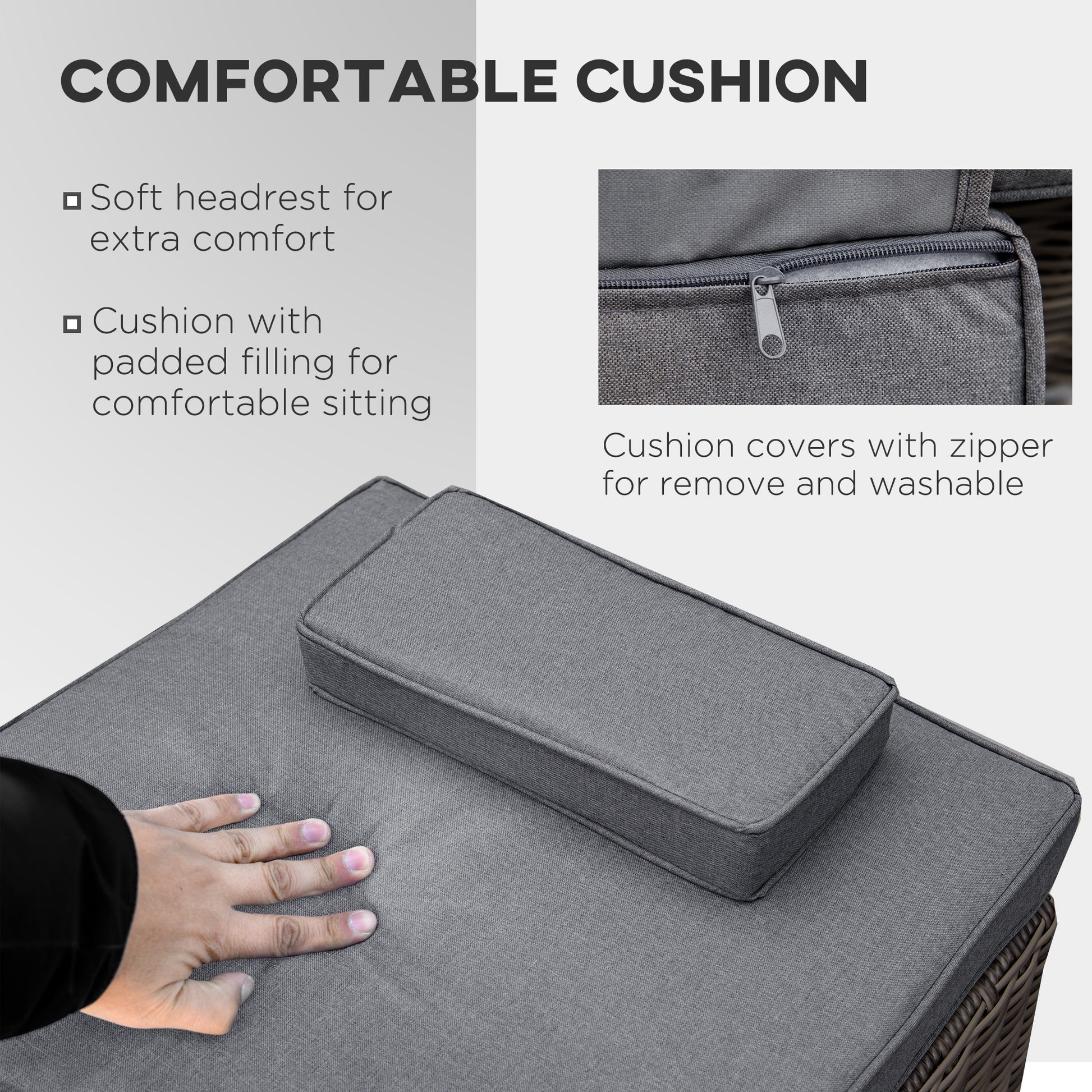 - Longline seat cushions, padded for comfort, with padded headrest. Water-resistant covers