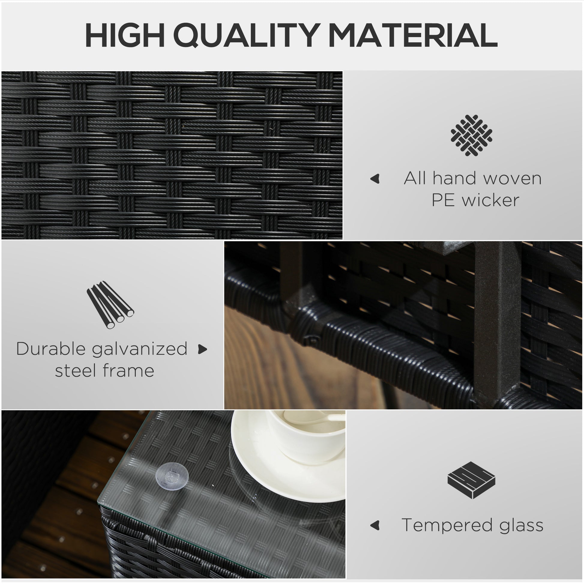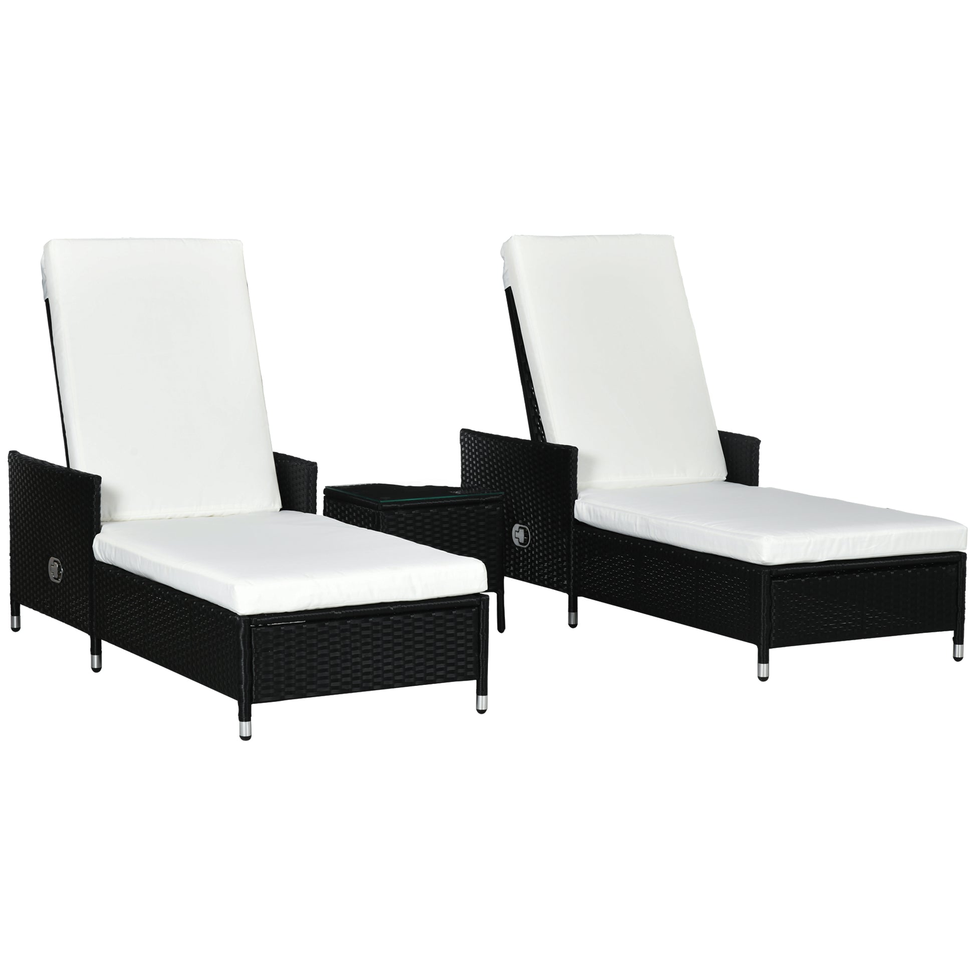 A place to relax under the sun, with this Outsunny three-piece lounger set. A powder coated steel frame for a strong core, wrapped in plastic wicker for style and protective coating. Set the backs of the loungers between 100°-160°. Completed with a small glass-top table.