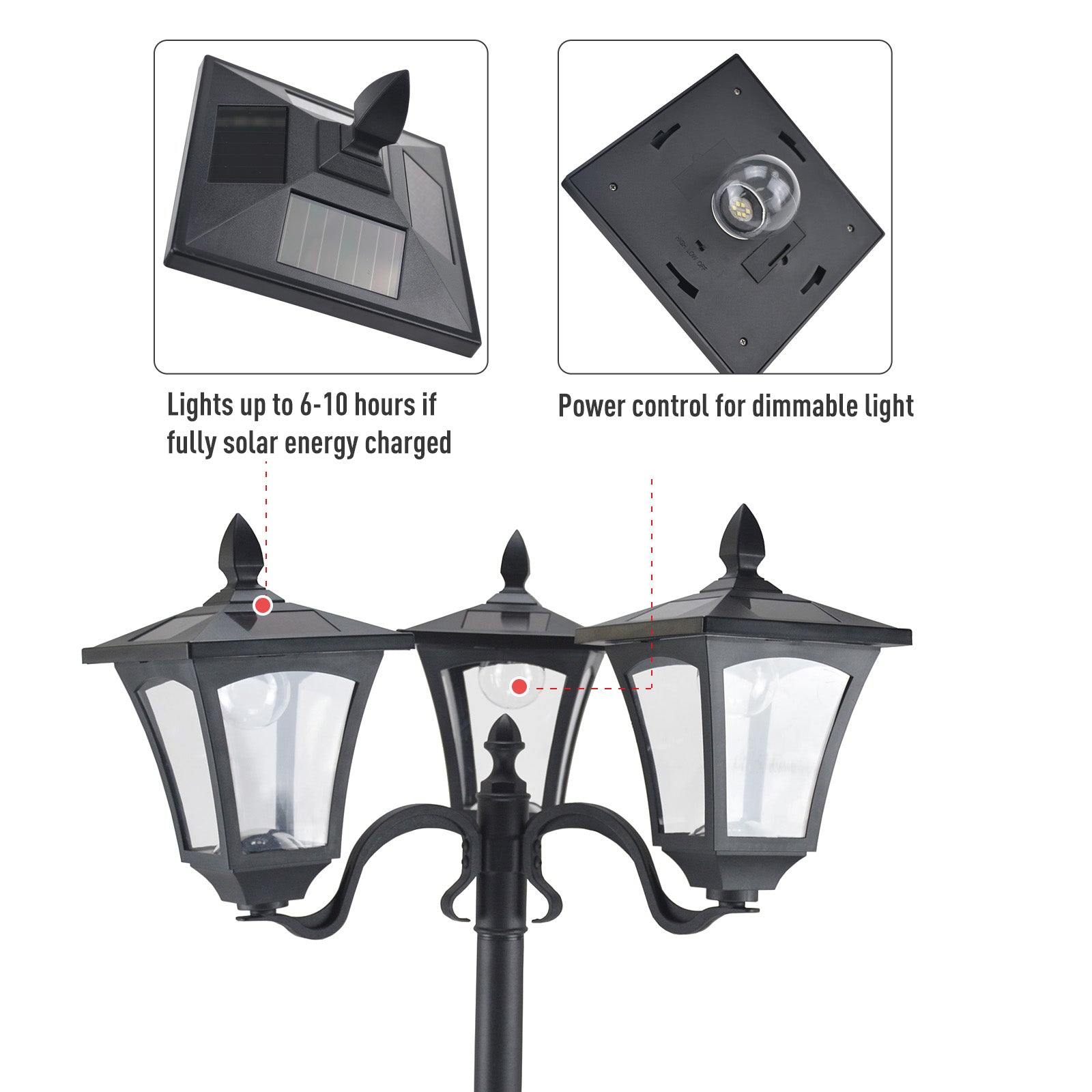 - Stainless steel lamp post connected with a removable plastic base for stability and durability
