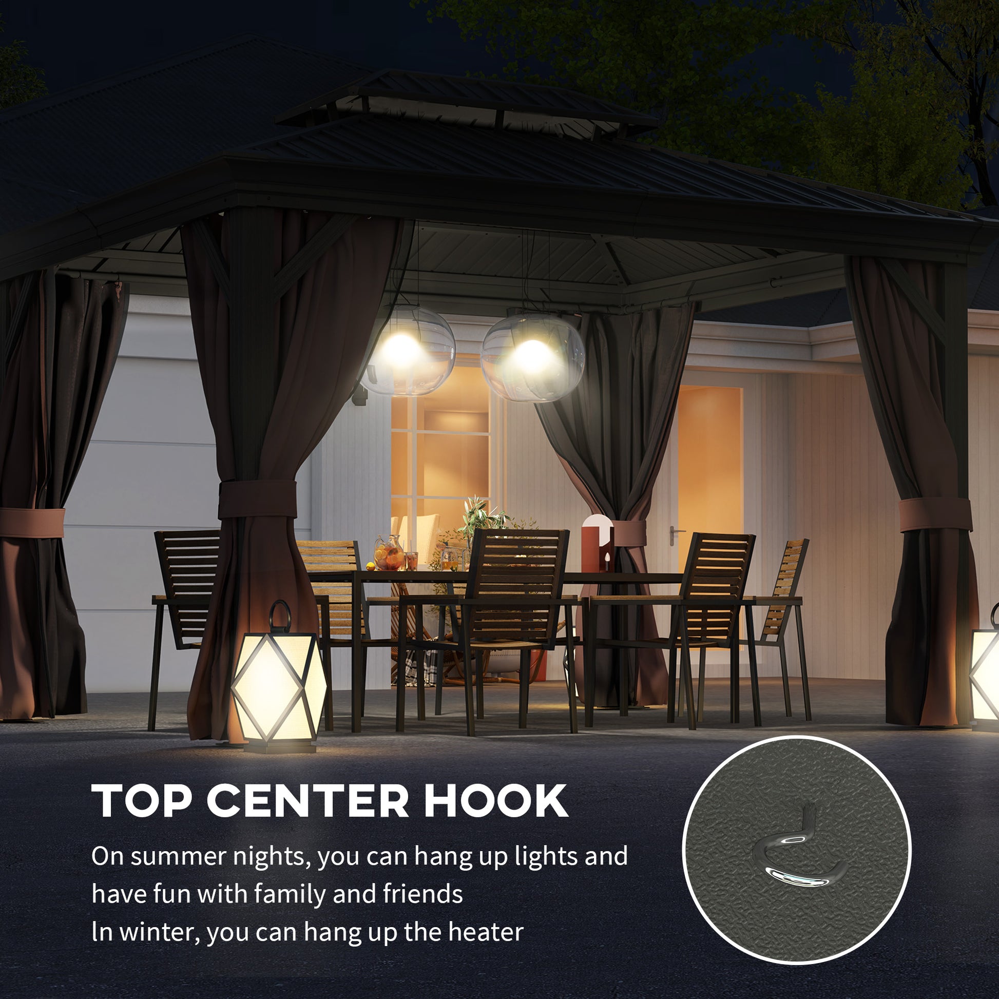 This garden pavilion from Outsunny is a must for creating the perfect party atmosphere. The aluminium frame, paired with the galvanised steel canopy means a strong and sturdy standing place. The curtains and netting create a comfortable and safe space. Set up this hard roof gazebo in the garden for anything you like - BBQs. special events and all day gatherings with friends.