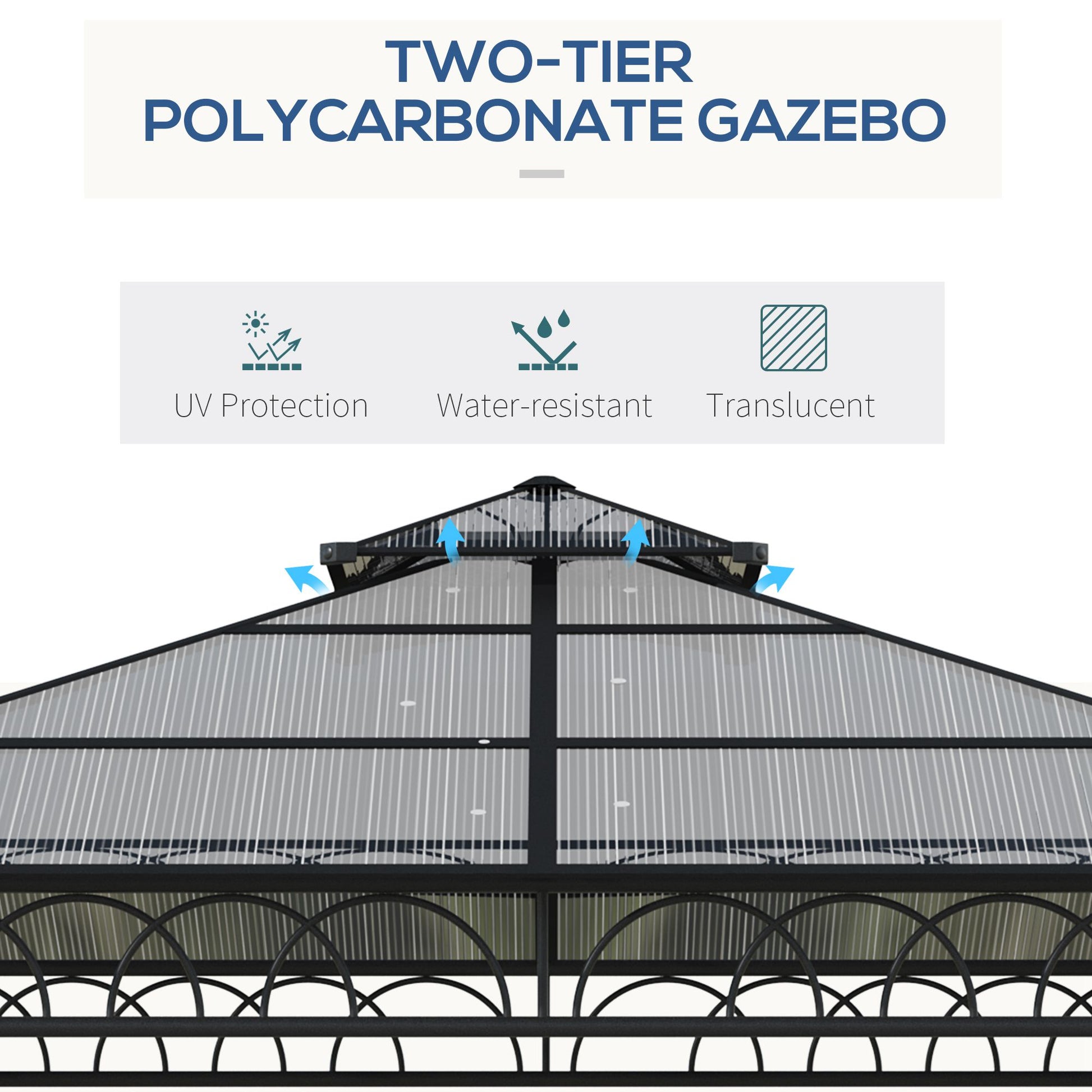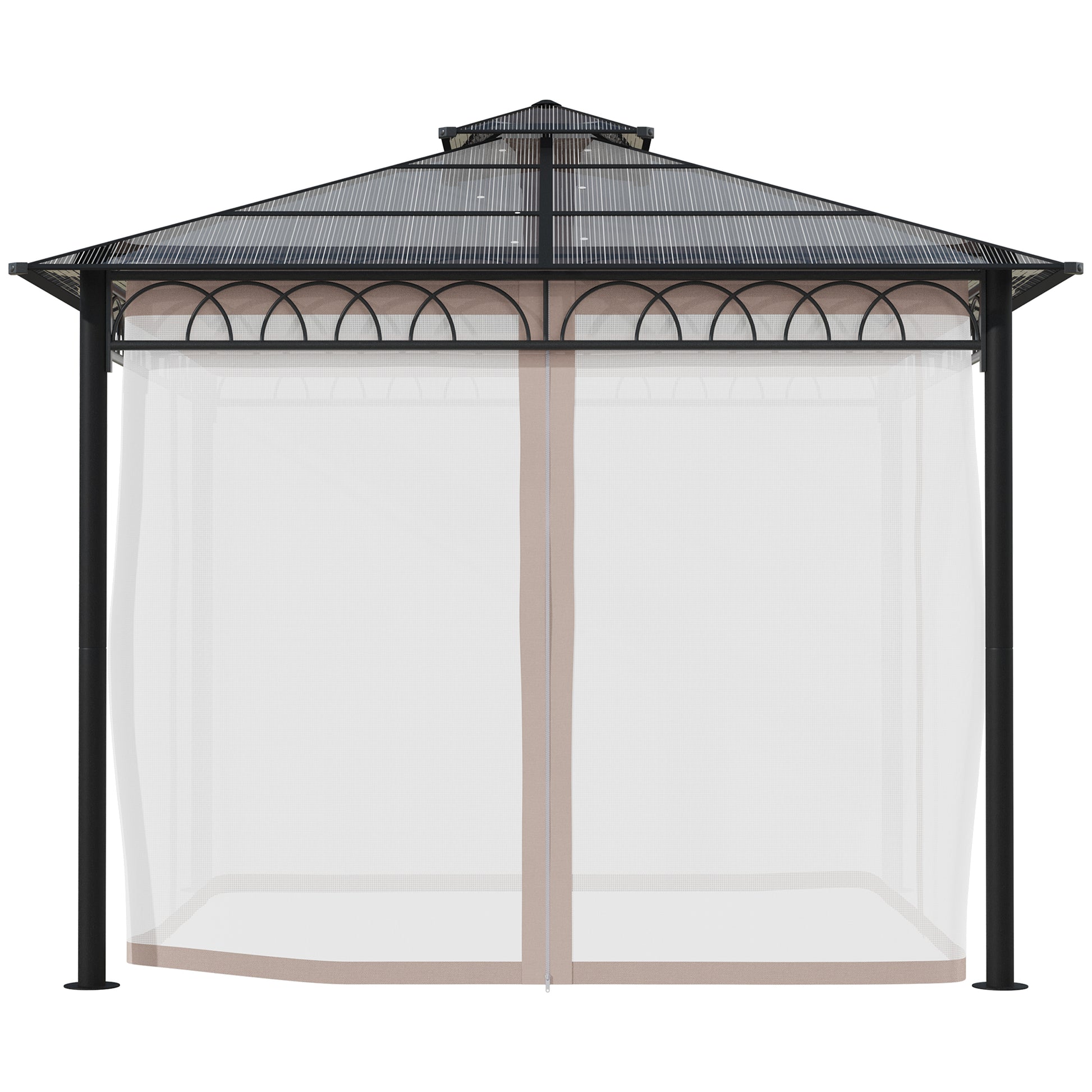 Outsunny 3 x 3 (m) Outdoor Polycarbonate Gazebo, Double Roof Hard Top Gazebo with Galvanized Steel Frame, Nettings & Curtains