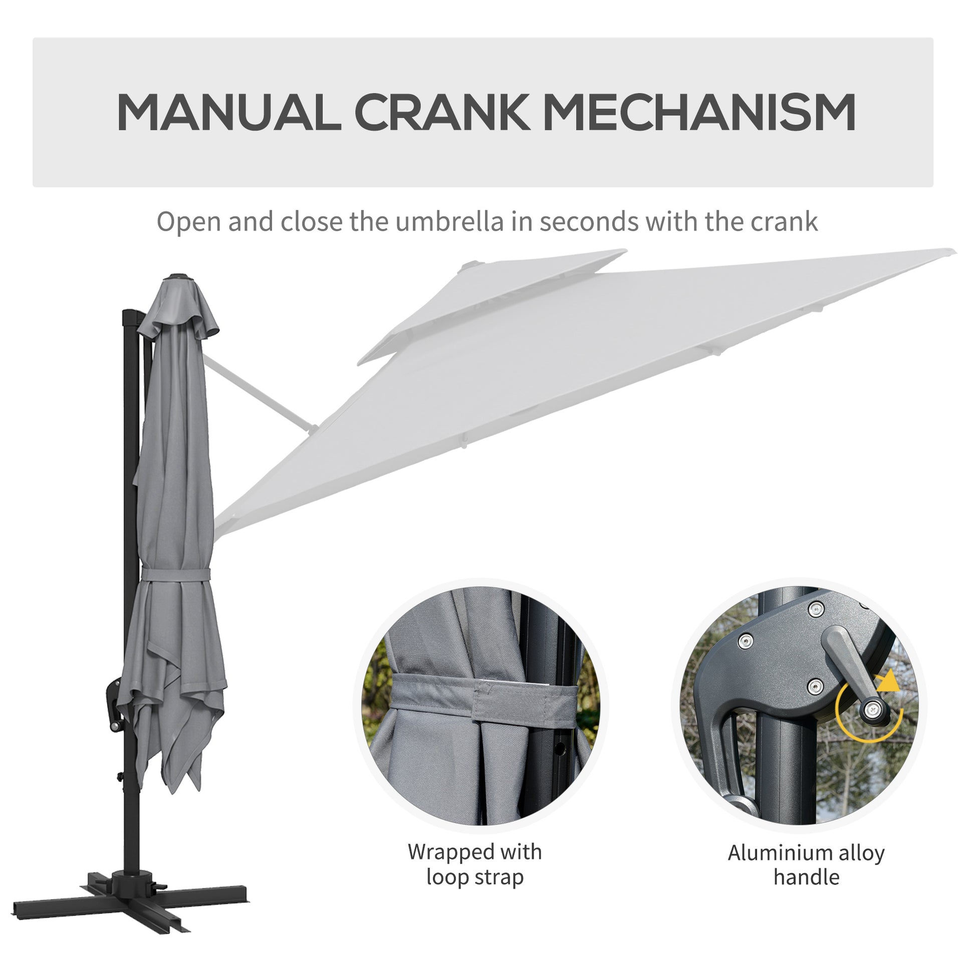 Outsunny 3 x 3(m) Cantilever Parasol with Aluminium Frame, Crank and Tilt, 360° Rotation, Double Top Garden Umbrella with Base and Cover, Light Grey