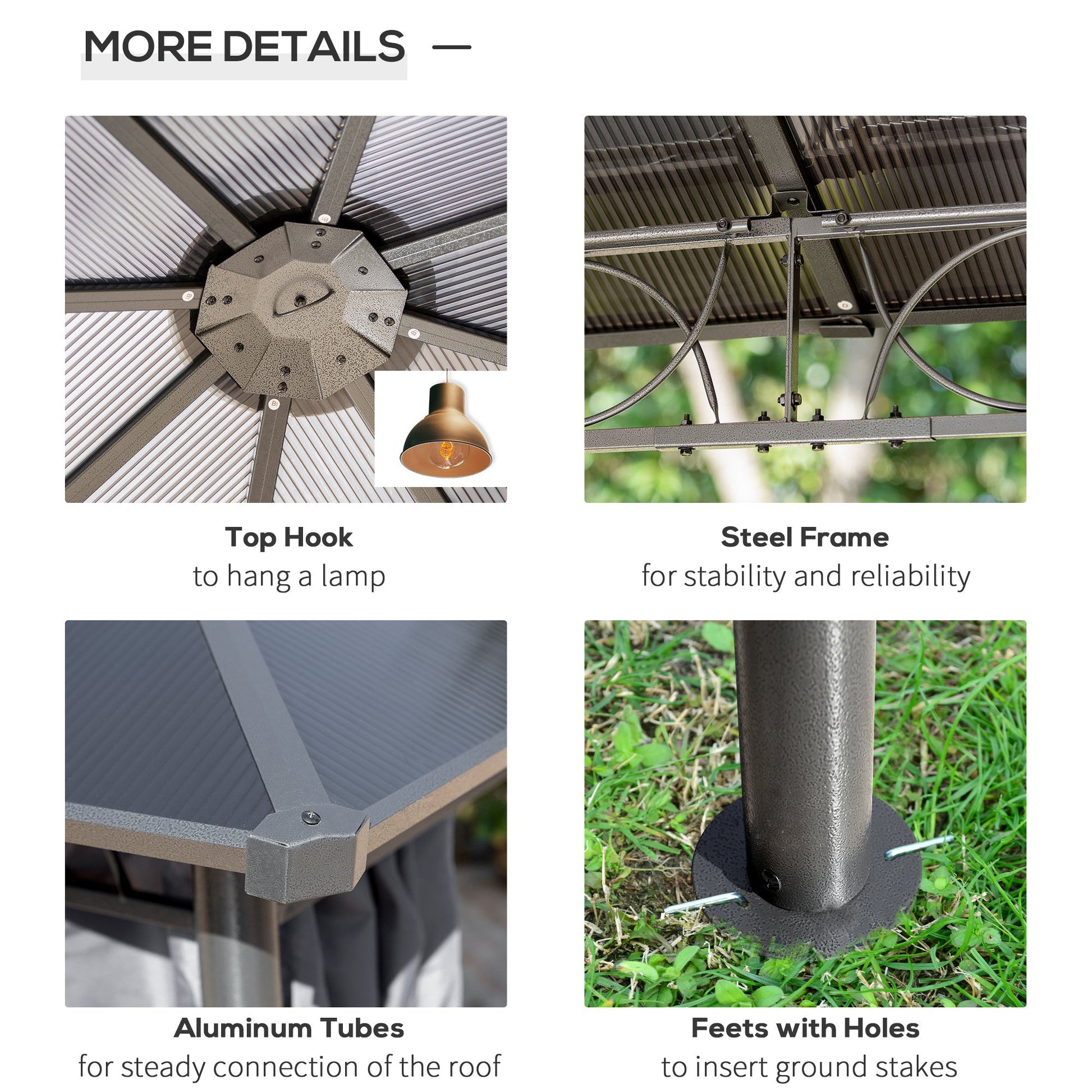 This outdoor gazebo is your best choice to relax and enjoy parties. The polycarbonate hard roof provide UV protection and double sided zipper curtains create a comfortable space. Its large sizing provides enough shelter for yourself and several other people. You can set up this gazebo in the backyard or poolside, have a nice gathering with friends or family. Let this practical gazebo to improve your happiness and life quality.