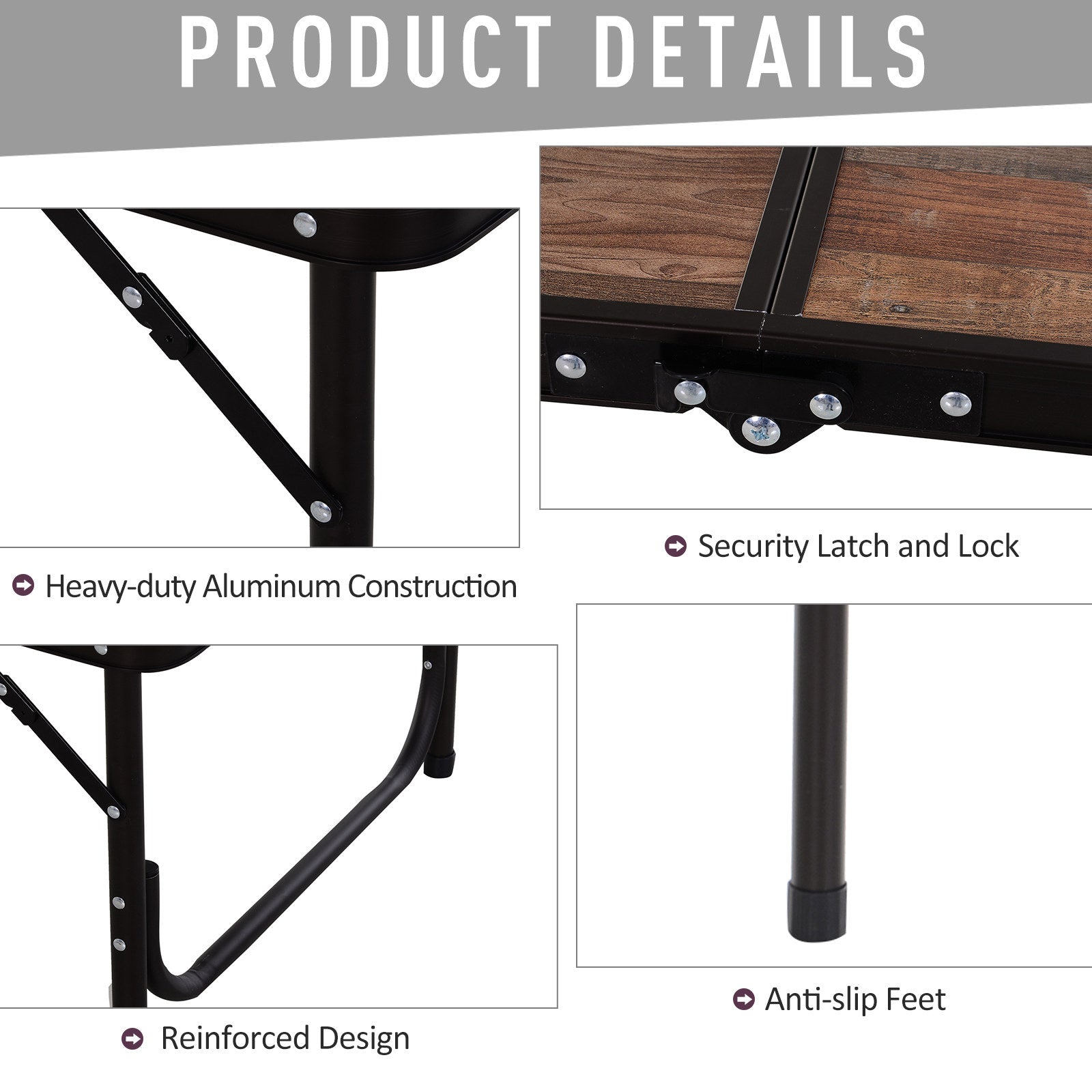 Serve dinner the easy way whilst on your camping trips and more with this table from Outsunny. Formed of heavy-duty aluminium for strength and durability which supports up to 30kg in weight, the rust and mild weather-resistant frame is fitted with two large tabletops to provide plenty of room for you to dine with others, with a wood grain sticker placed on top for a beautiful look. Adjustable to two different heights, the frame is able to collapse into a suitcase-style design, with a handle and two locks for easy and secure carrying.