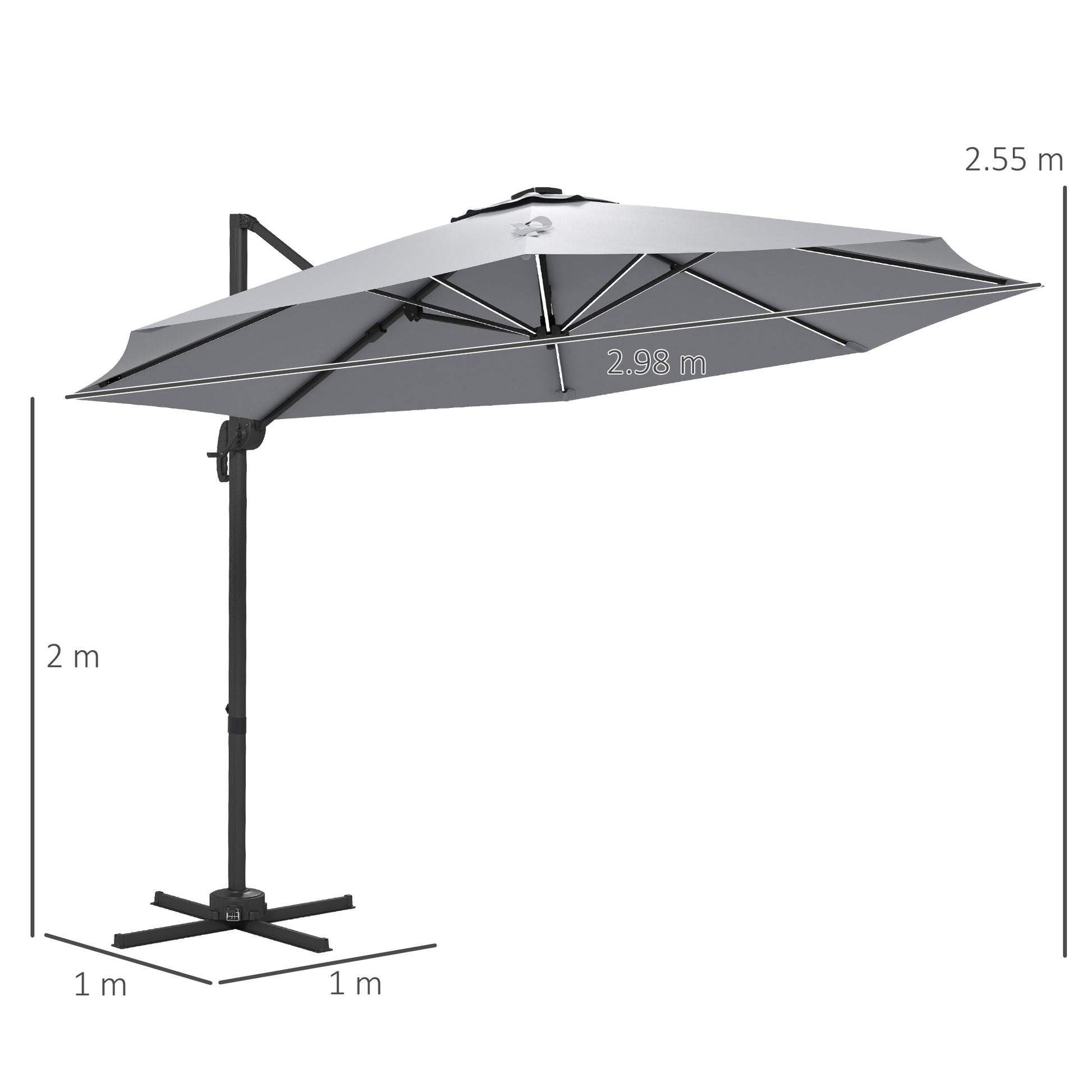 Outsunny 3(m) Adjustable Cantilever Parasol with Base, Solar LED Lights, Light Grey