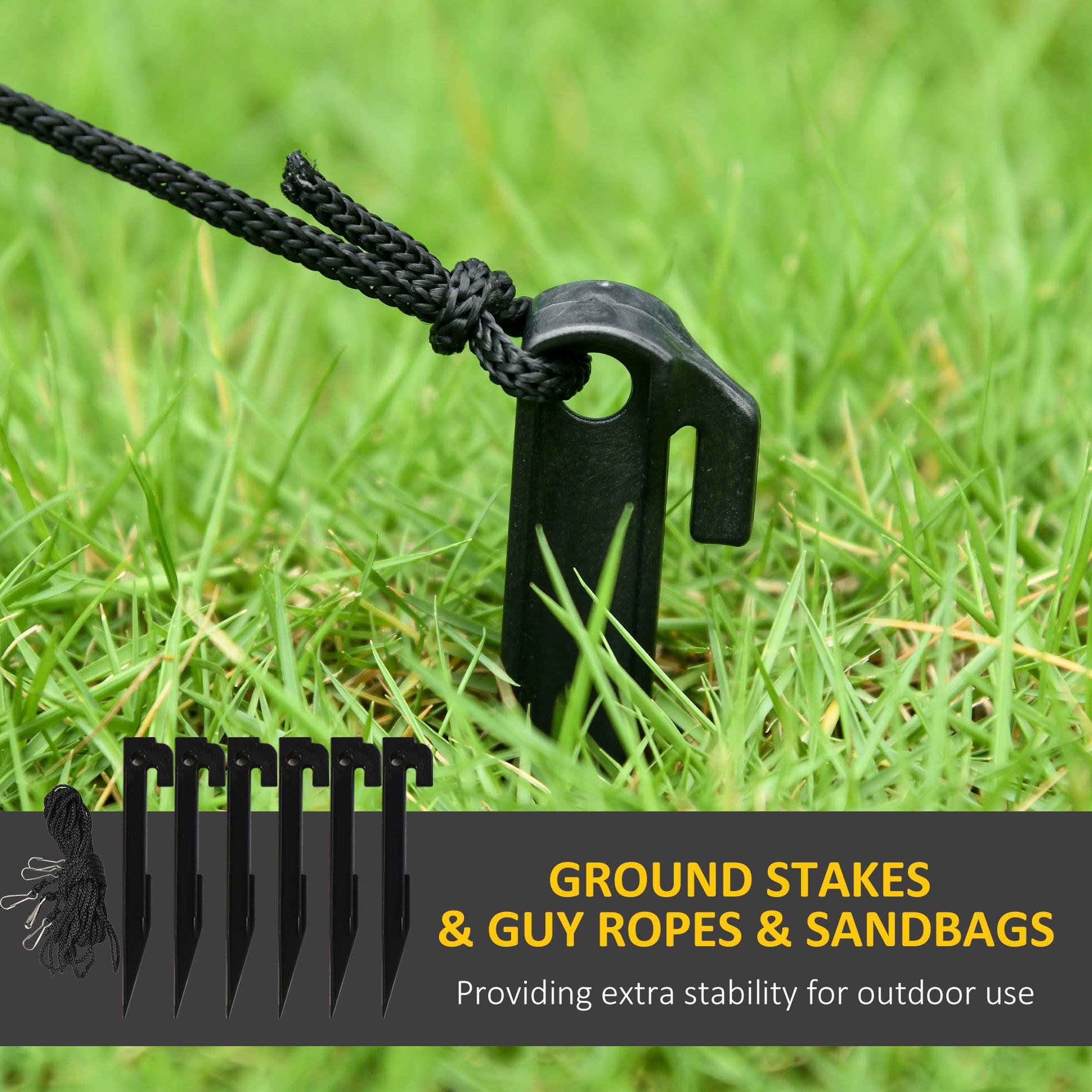 - Six ground stakes, two guy ropes and two sandbags to stabilise to ground