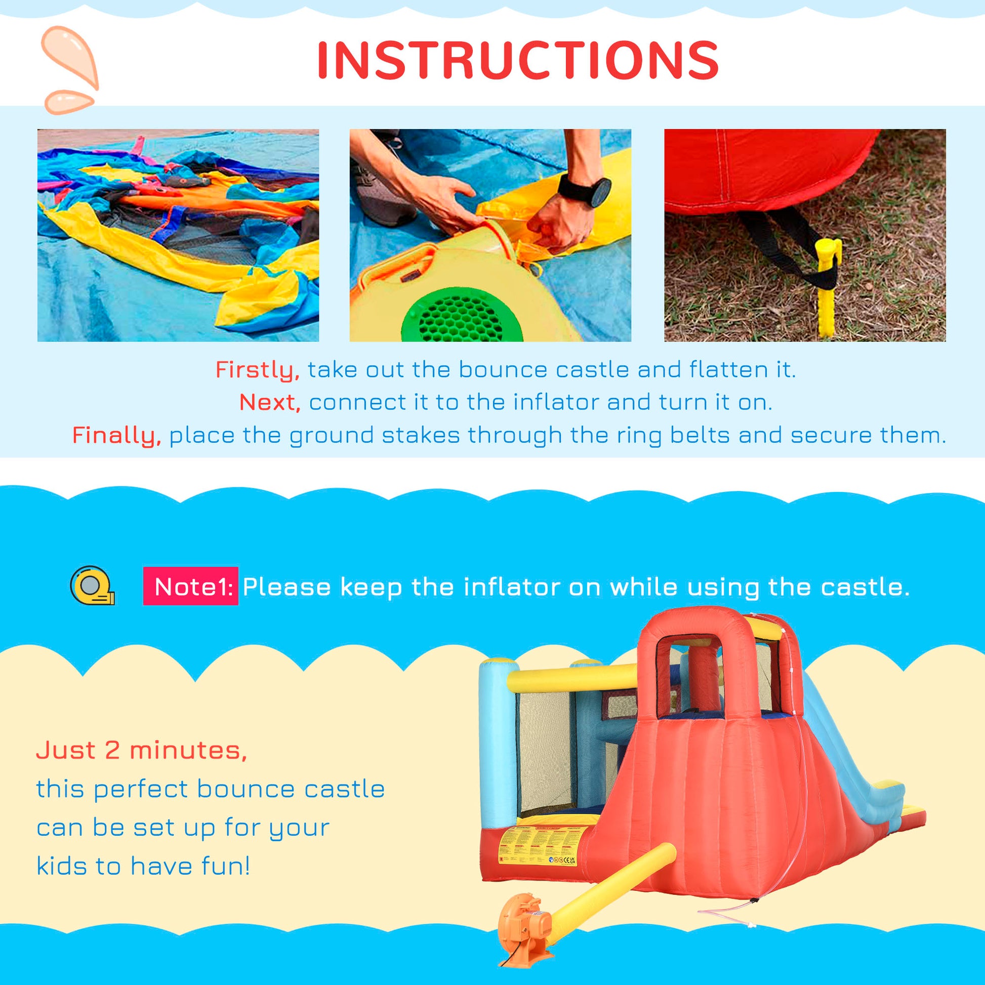 - Ground stakes included, pinning the castle to the ground to keep secure