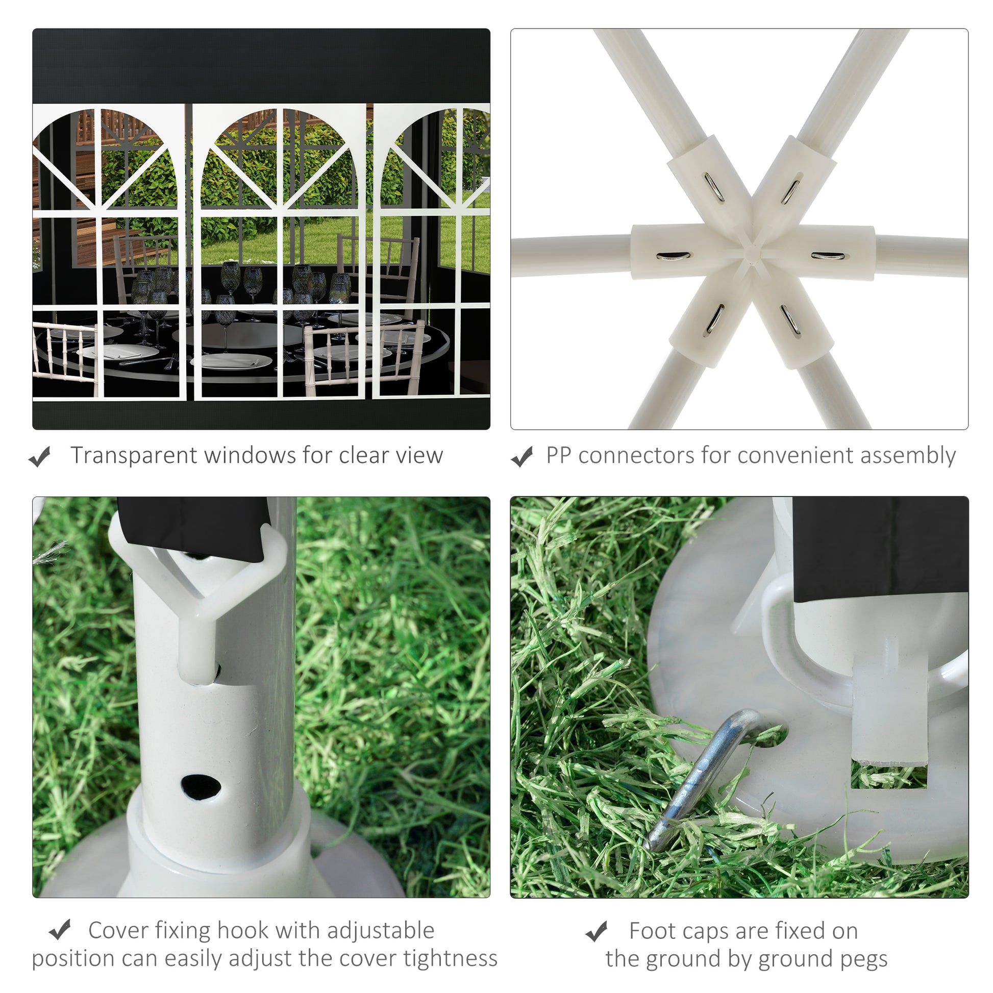 Choose this Outsunny hexagonal gazebo for outdoor gatherings this season. A large size for plenty of hosting room, with removable walls to switch from an open atmosphere to closed in an instant. The included guy ropes and ground nails add to the stability. The zip fastening on the main door allows you to enter and leave easily. This marquee gazebo with sides is finished with transparent windows to see through the other side.