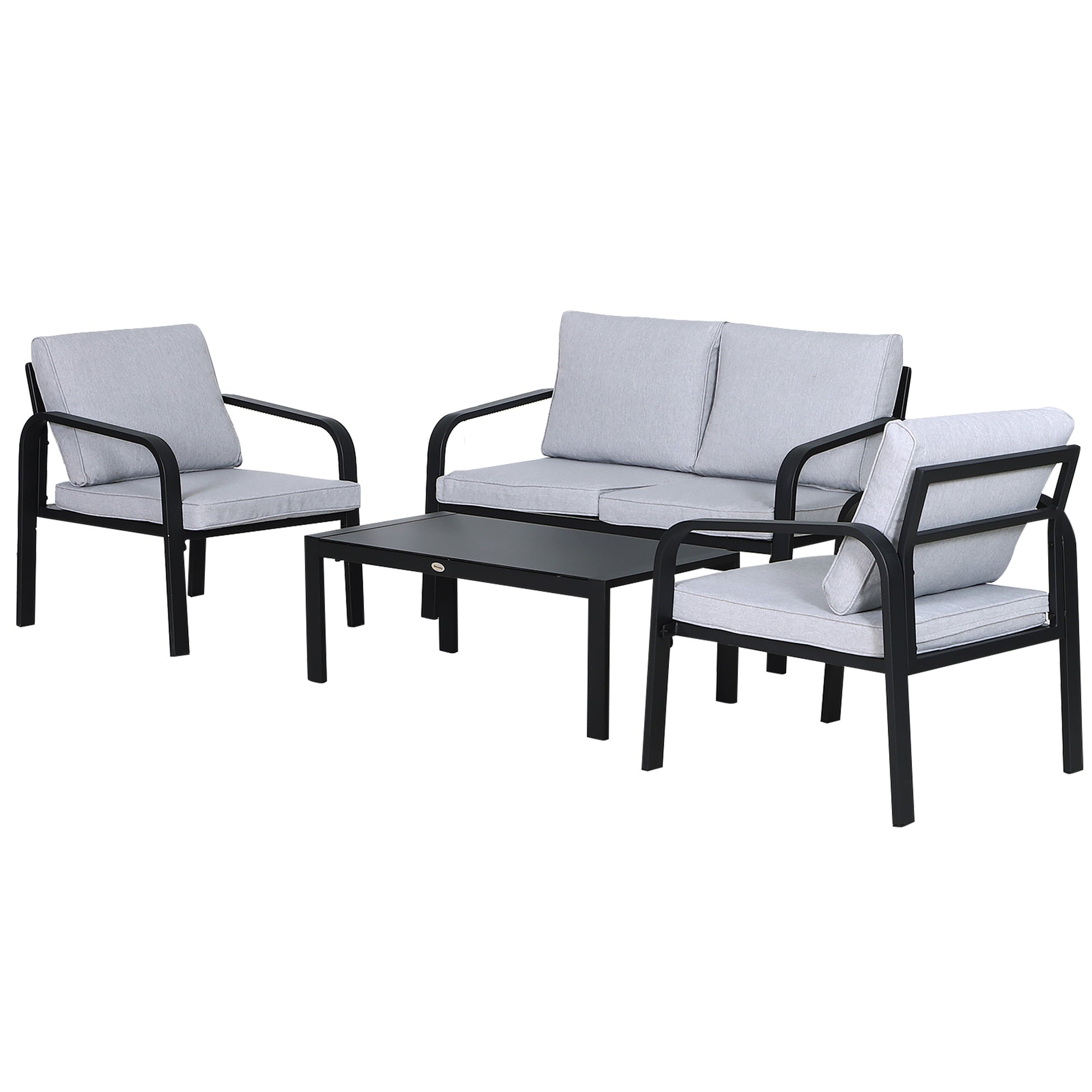 Outsunny 4 Piece Aluminium Frame Garden Dining Set w/ 2 Chairs Sofa Glass Top Table Foam Cushions Sleek Contemporary Tough Durable Grey Black