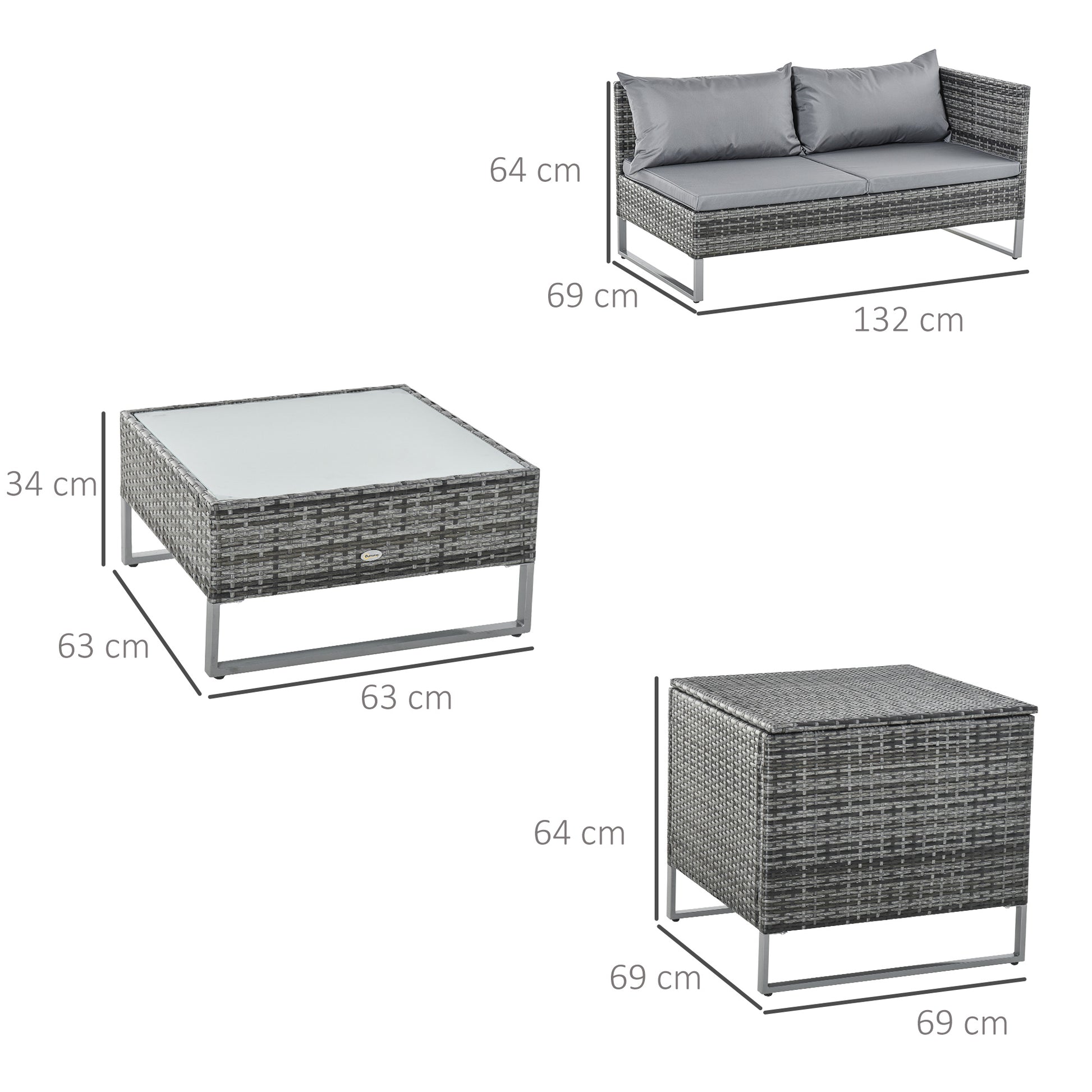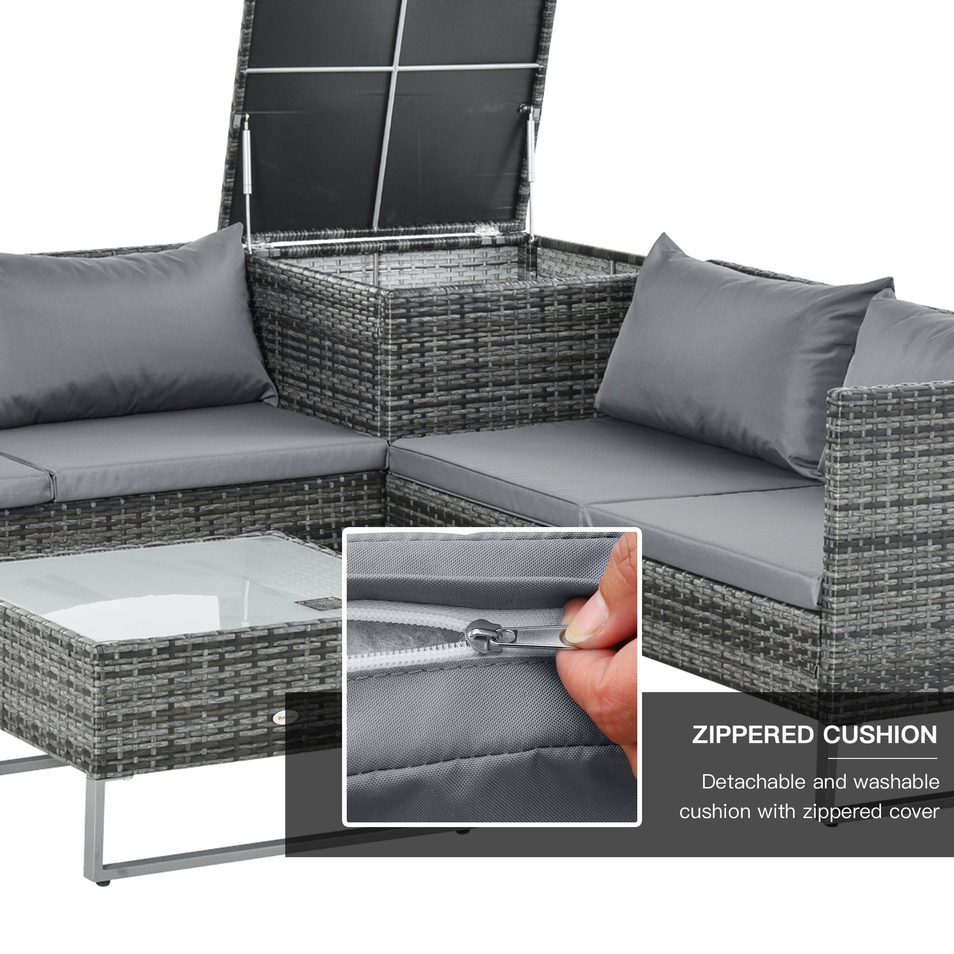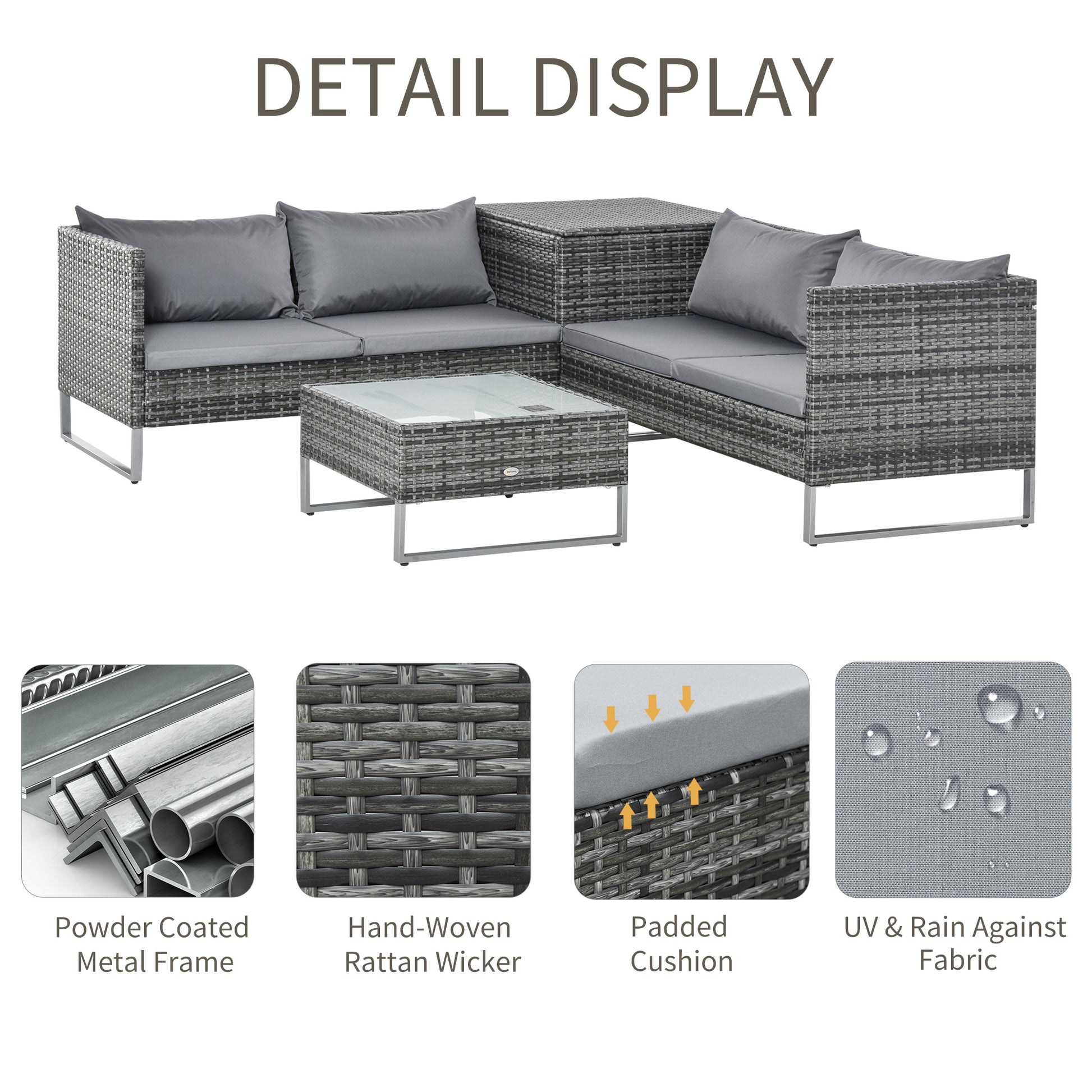 Outsunny 4 Piece Garden Rattan Wicker Outdoor Furniture Patio Corner Sofa Love Seat and Table Set with Cushions Side Desk Storage - Mixed Grey