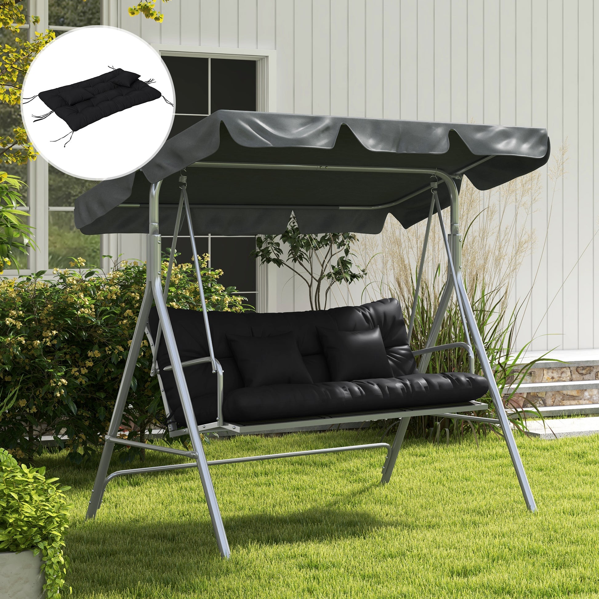 - 4 pieces: a seat cushion, a back cushion and two pillows. Suitable for 3-seater seating