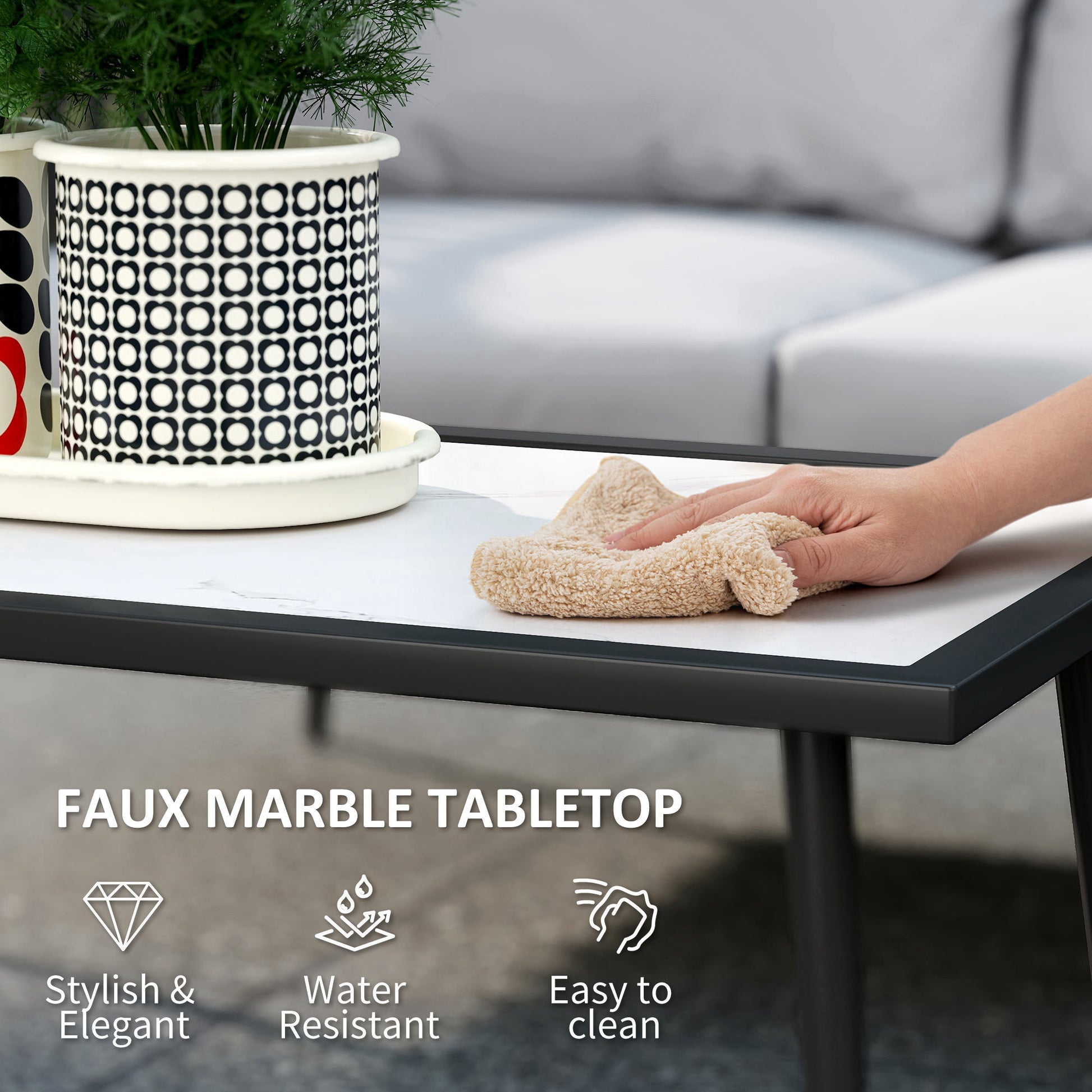 Transform your garden into a cosy haven with the Outsunny outdoor table and chairs. This four-piece ensemble, featuring a loveseat, two armchairs and a coffee table, brings comfort with removable and washable cushions. The faux marble tabletop adds a touch of elegance, making it a stylish addition to any patio furniture set. Enjoy the crafted woven design armrests that blend seamlessly with any outdoor decor.