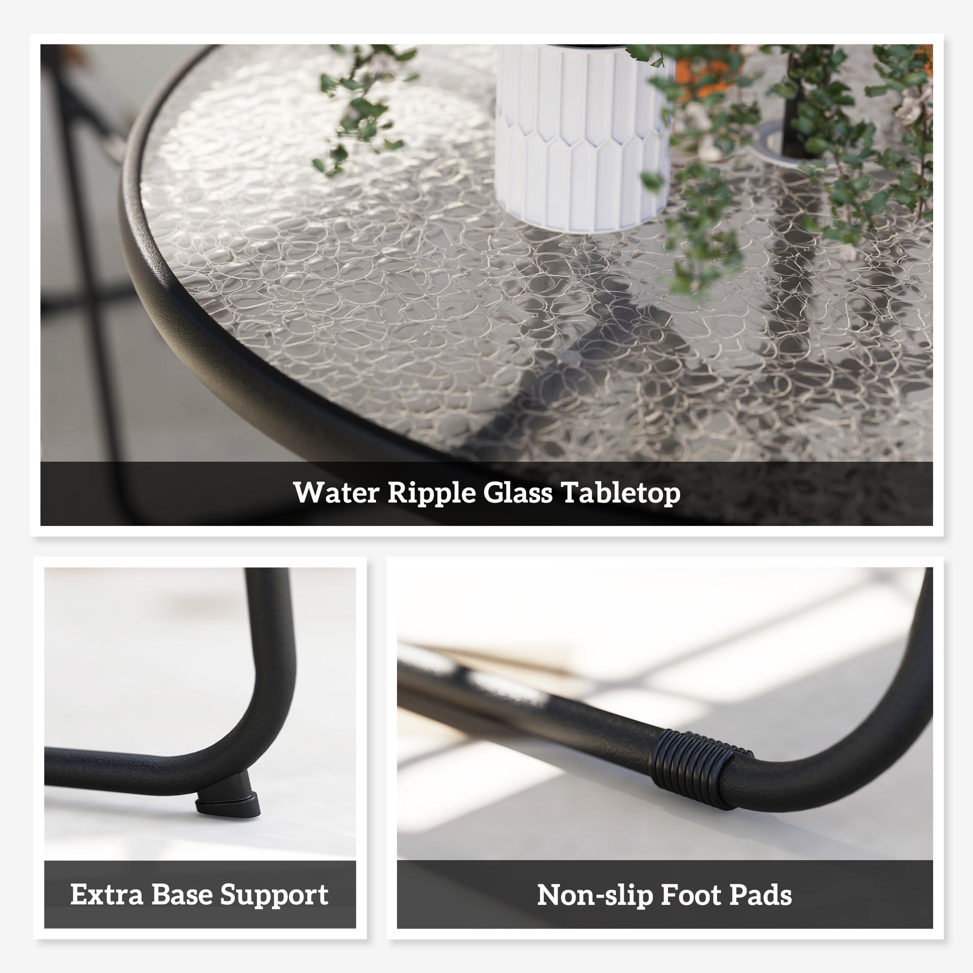 - Glass tabletop with water ripples, tough, stylish and easy to maintain