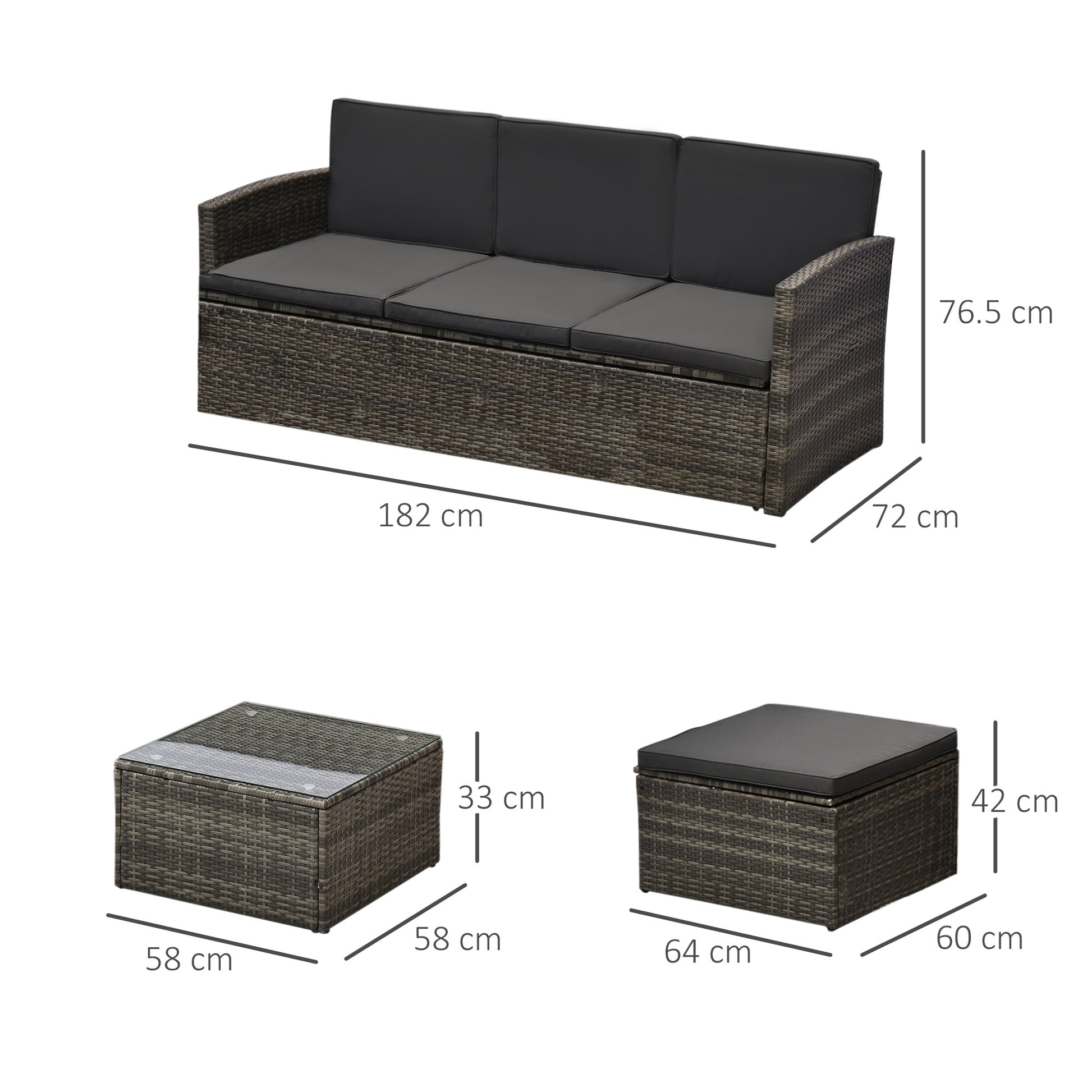 Welcome this three-piece set into your home, from Outsunny, for a place which will make the Summer days better than ever imagined. It's formed of three pieces: a three-seater sofa, a footstool and a square coffee table. Powder-coated steel frames make each piece strong and supportive, wrapped in durable and protective plastic wicker for a garden-beautiful look. Relax in comfort, thanks to the padded cushions. Take a break, all season long.