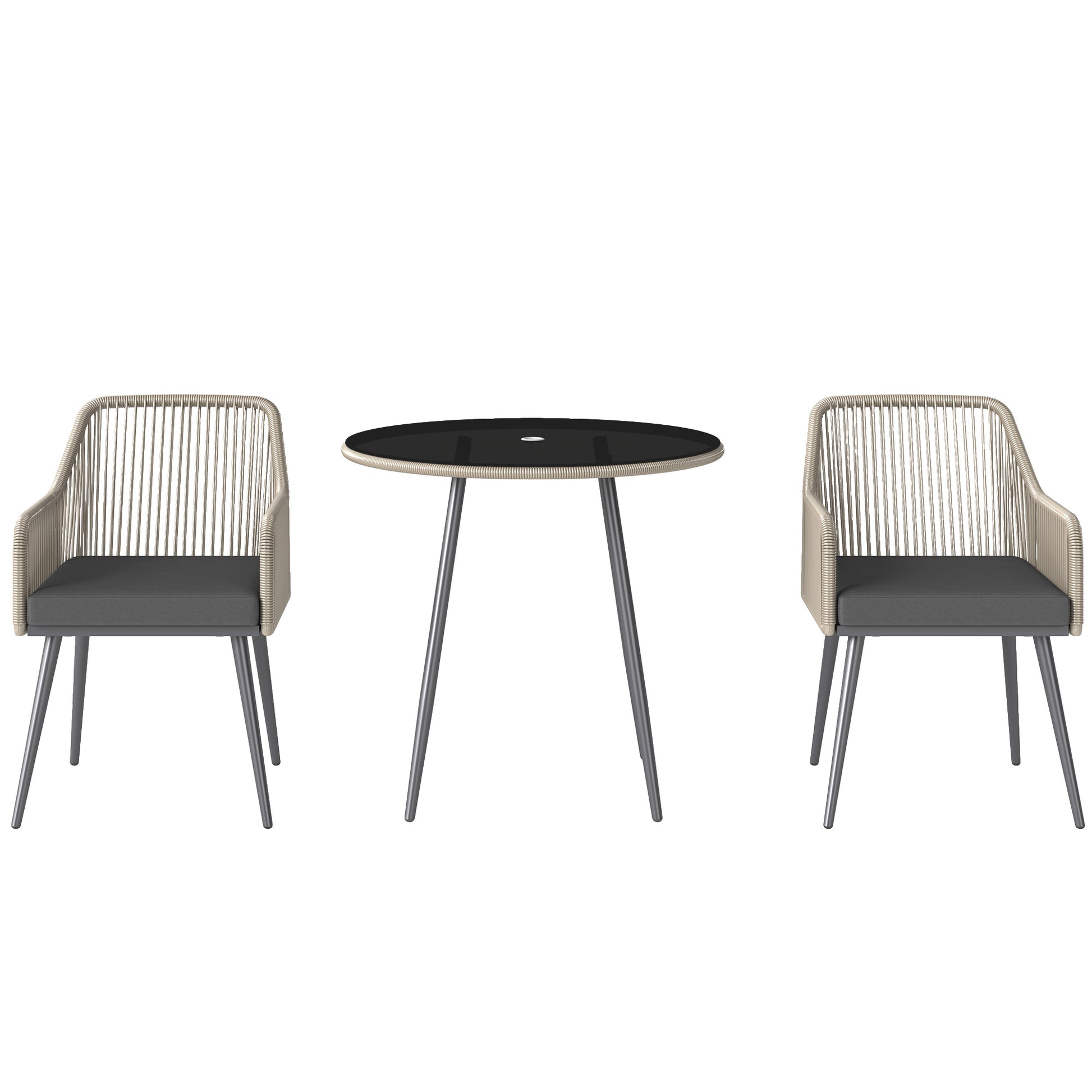 A simple yet reliable way to bring everyone together, this season and beyond with this Outsunny rattan garden table and chairs set. It comes with four chairs and a matching table, with the frames of all pieces made of steel for strength, wrapped in stylish and protective plastic rattan. The twisted rattan back and curved armrests support your body, with padded cushions for comfort. The outdoor dining set is complete with a glass-top table, with Φ4.2cm middle hole to hold a parasol in place.