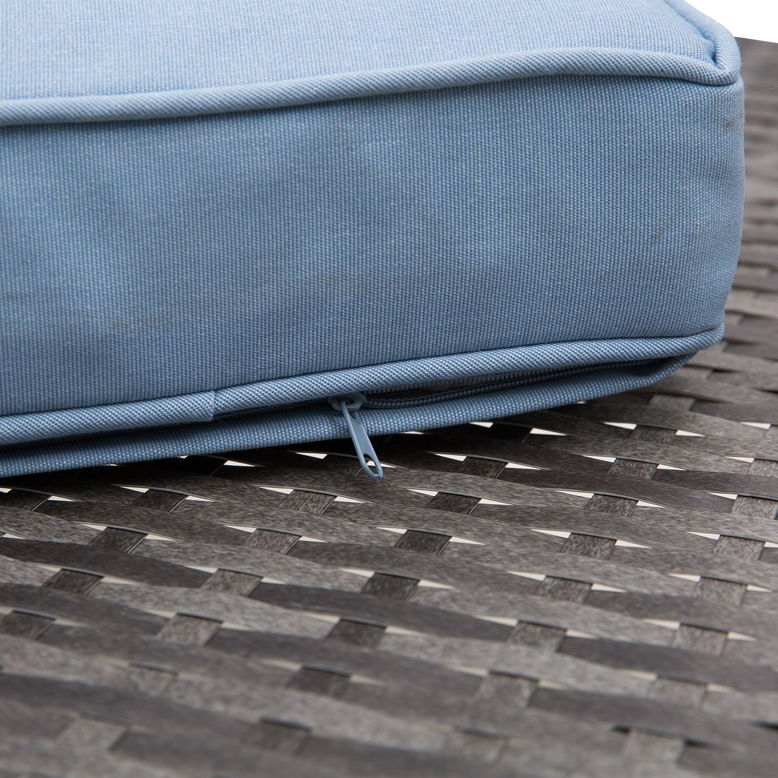 Make lounging in the garden better than ever before – choose this colourful and stylish set for comfortable seating you'll find hard to resist. Four pieces in the package: two two-seater sofas, a matching square table and a square footstool, where solid metal forms the underlying structure for a stable frame, with PE wicker rattan wrapped around. Thick blue cushions on the seats and backs are perfect for sinking in to, with removable and washable covers to keep them clean and fresh.