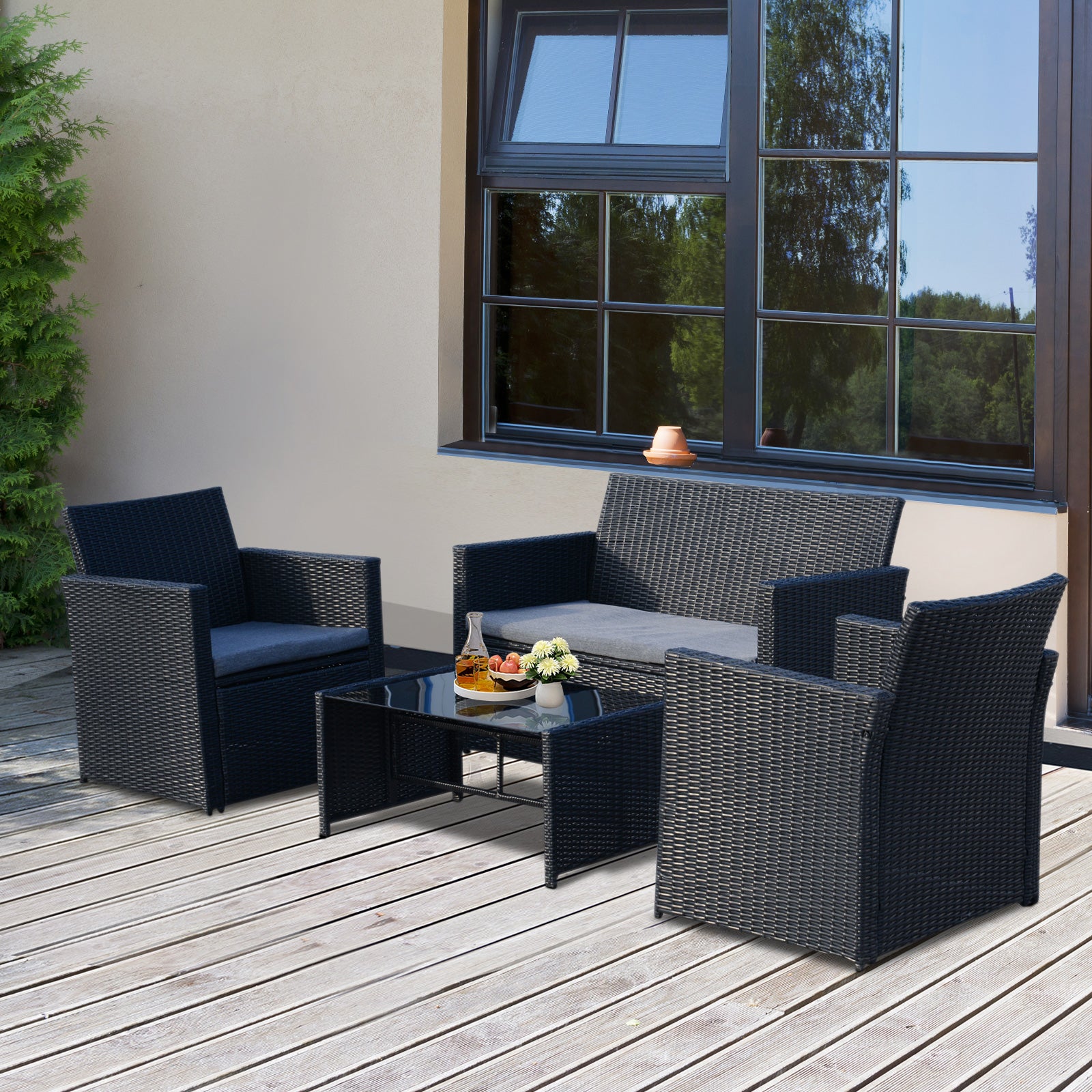 Outsunny 4-Seater Rattan Sofa Set Garden Furniture Wicker Weave 2-seater Bench Chair & Coffee Table Conservatory Furniture, Black