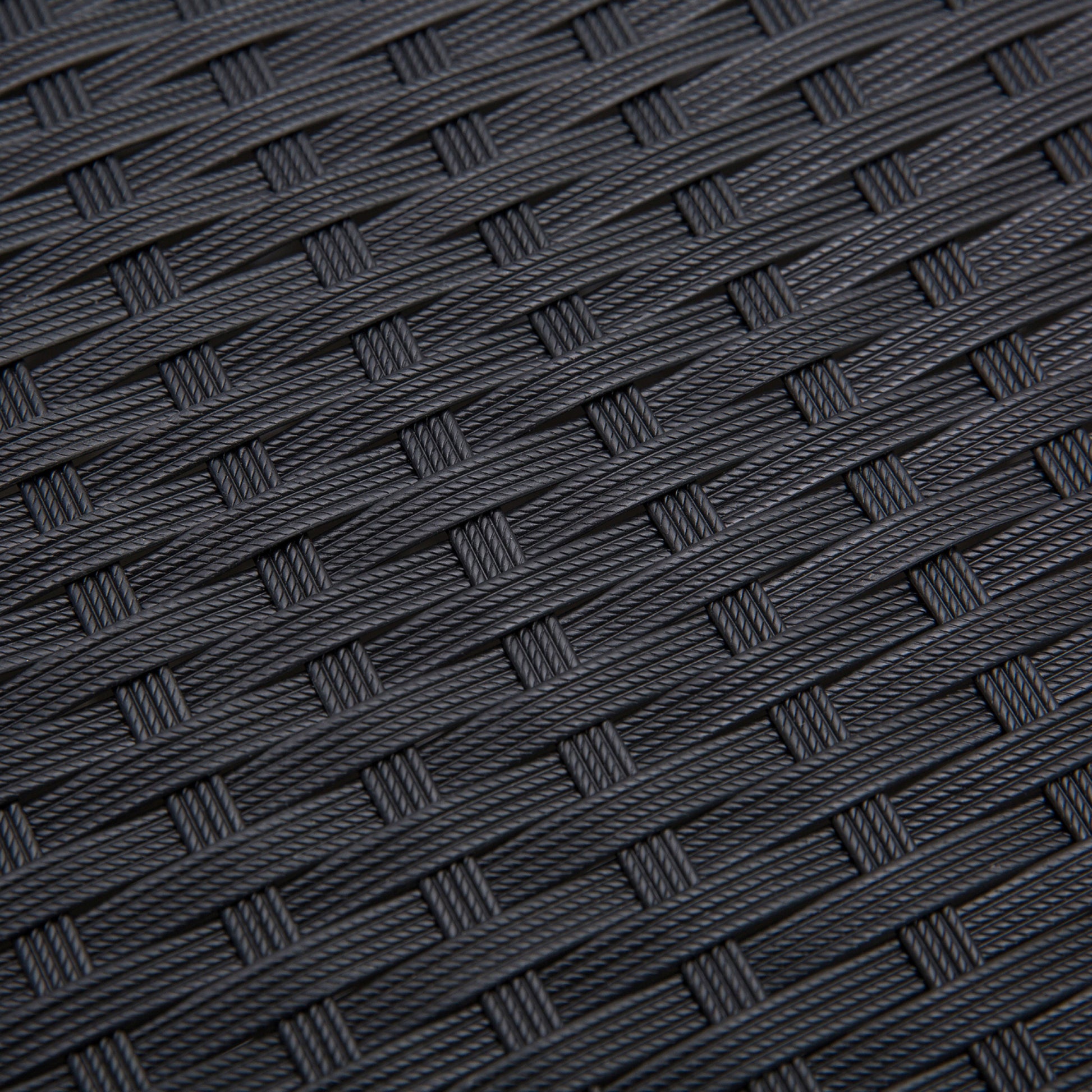 - includes two wide chairs, a two-seat sofa and large coffee table • Matte black metal frame with dark grey PE rattan panels, a muted and stripped back look