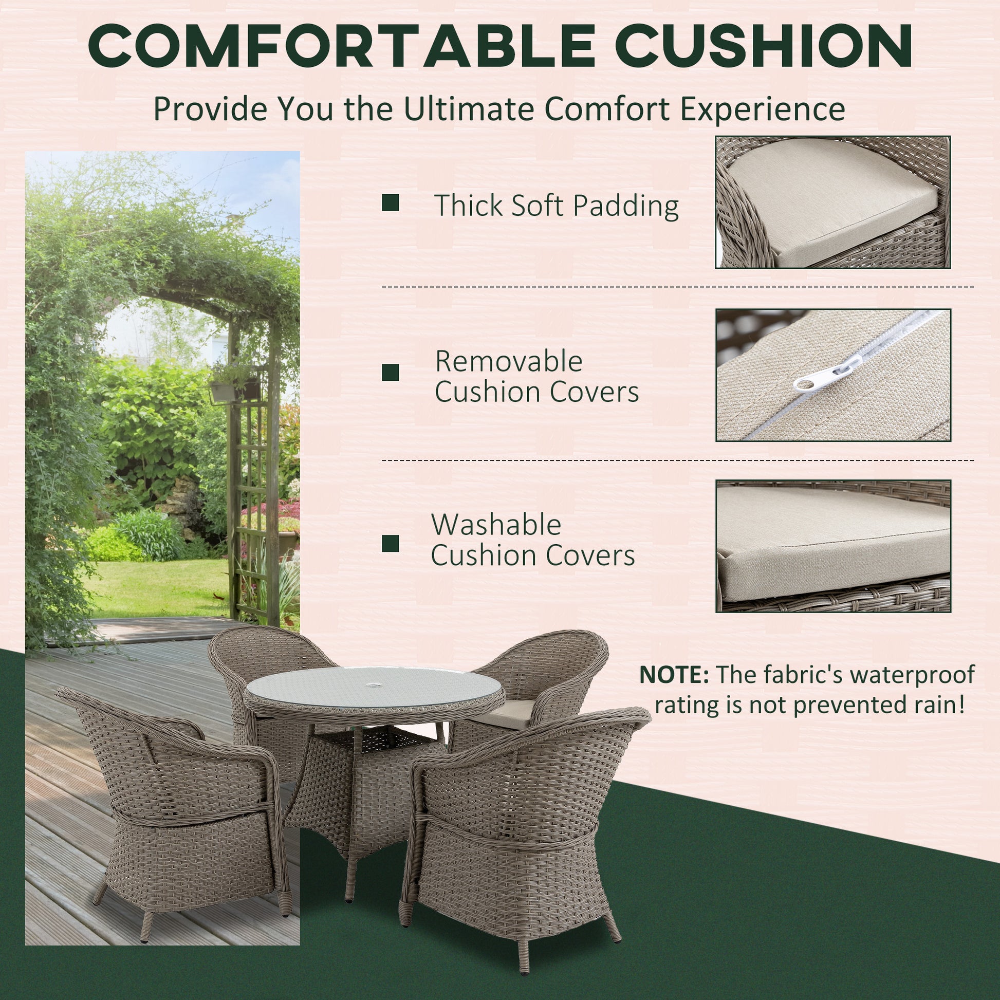 Gathering guests around this season, and beyond, don't come as stylish as this. The garden sofa dining set pairs a sleek glass-top table with on-trend mixed grey rattan for a welcome addition to your garden and outdoor areas. Comes with four armrest chairs, each with a padded seat cushion for comfort and high back and armrests for support. The middle hole in the table of the rattan garden dining set offers a place for a parasol to keep you safely shaded. Relax in comfort and style with Outsunny.