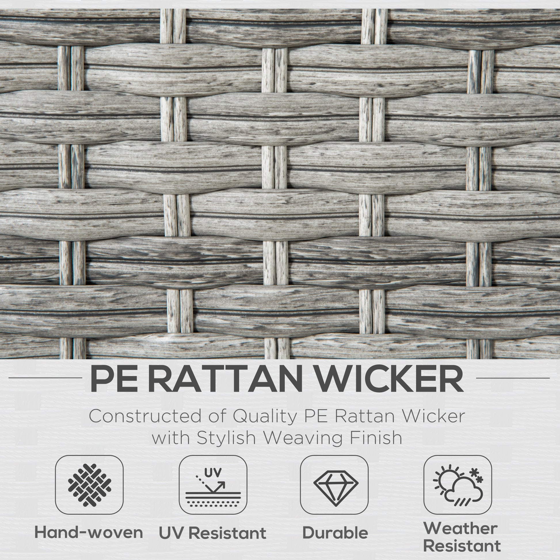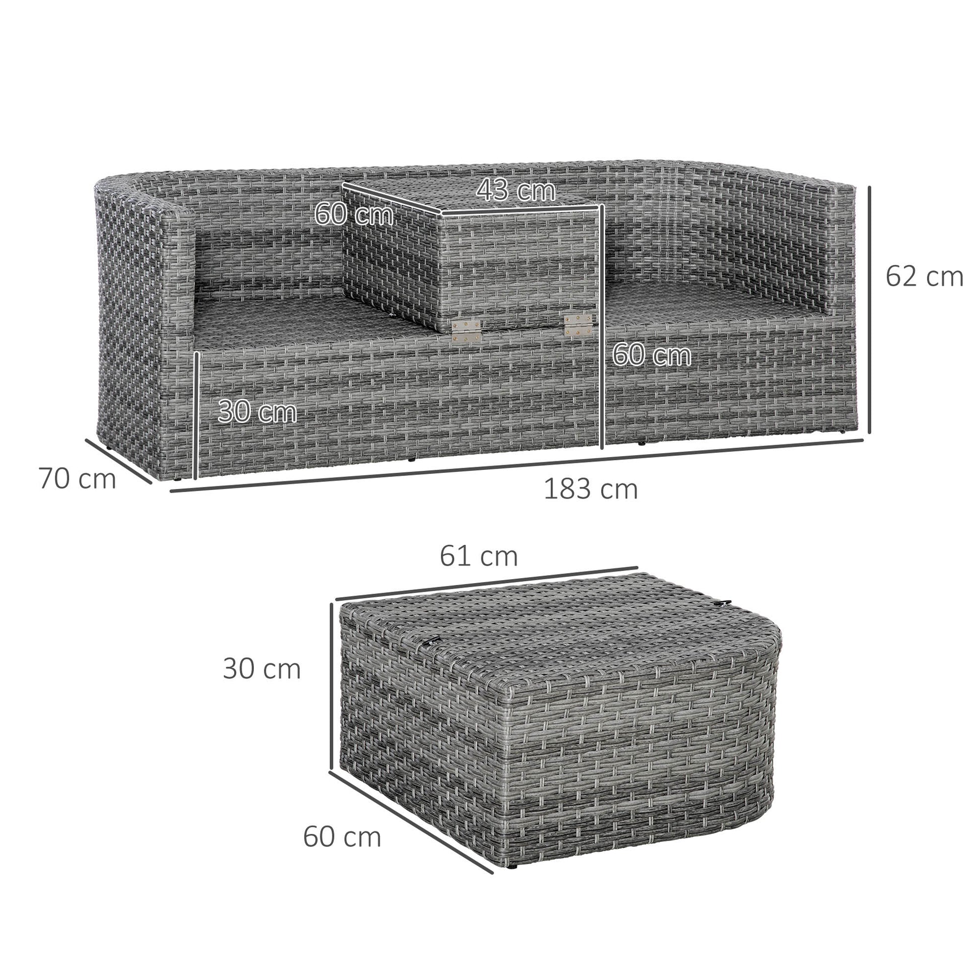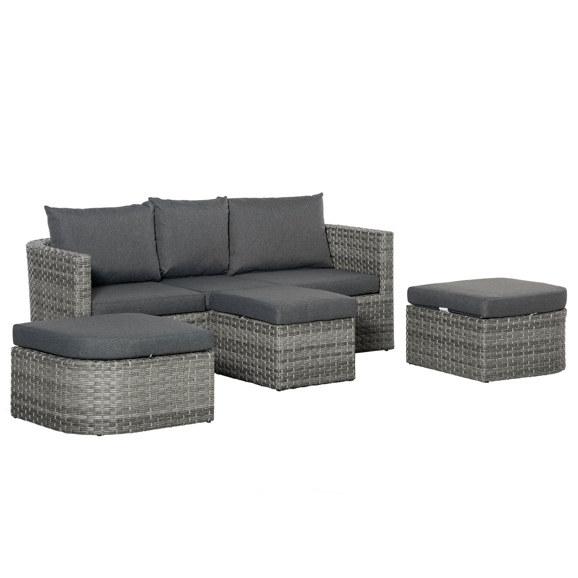 Flip down for more room, flip up for a handy table - this Outsunny garden sofa does more than it looks like. The 2 seater rattan sofa is fitted with a middle platform, when dropped down can be paired with the footstools to double your legroom. The footstools of the conservatory furniture are also great to expand your seating room outdoors, as all seats come with padded cushions to keep your comfort. The powder coated aluminium frames are strong, wrapped in protective plastic wicker to finish.