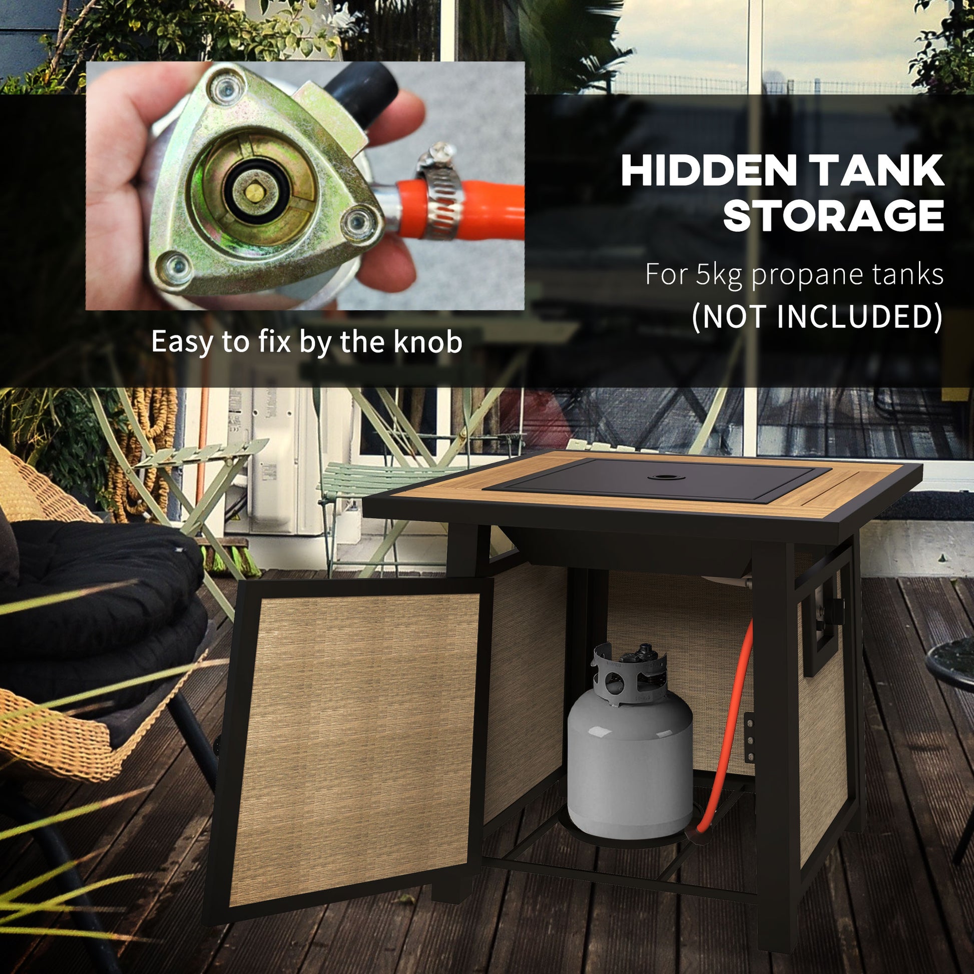 Enjoy cosy warmth and add beauty to your garden all year round with Outsunny. Outsunny brings form and function with this rustic outdoor propane fire pit table. Use the table to set down drinks, other objects and eat with friends. Use the 50,000 BTU burner to create a clean-burning flame without dealing with messy ashes. The glass beads help retain warmth and add charming ambiance. Placed on the porch, patio, or garden it adds charming ambiance to any outdoor area.