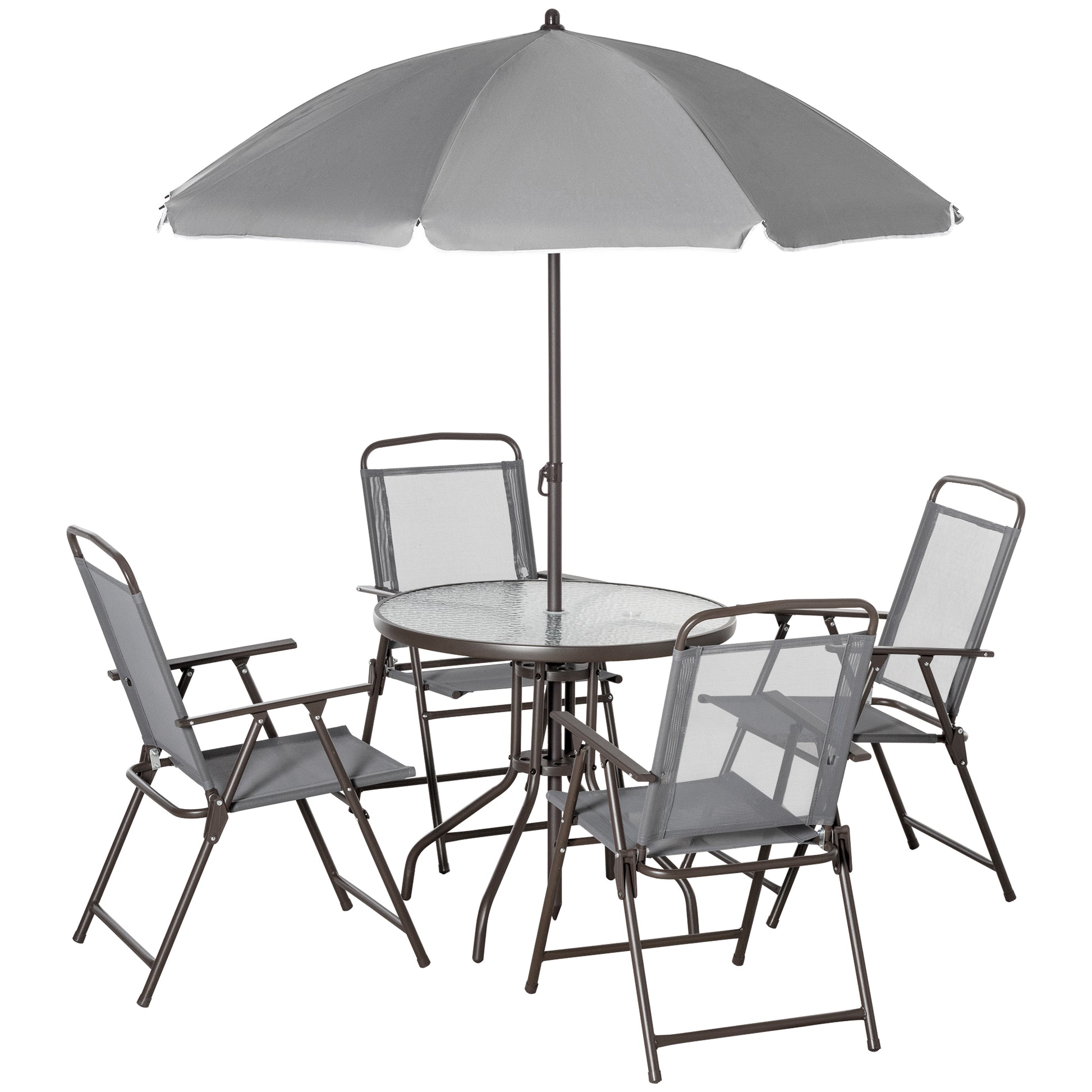 Outsunny 6 Piece Patio Dining Set with Umbrella, 4 Folding Dining Chairs & Round Tempered Glass Table for Garden, Backyard and Poolside, Grey
