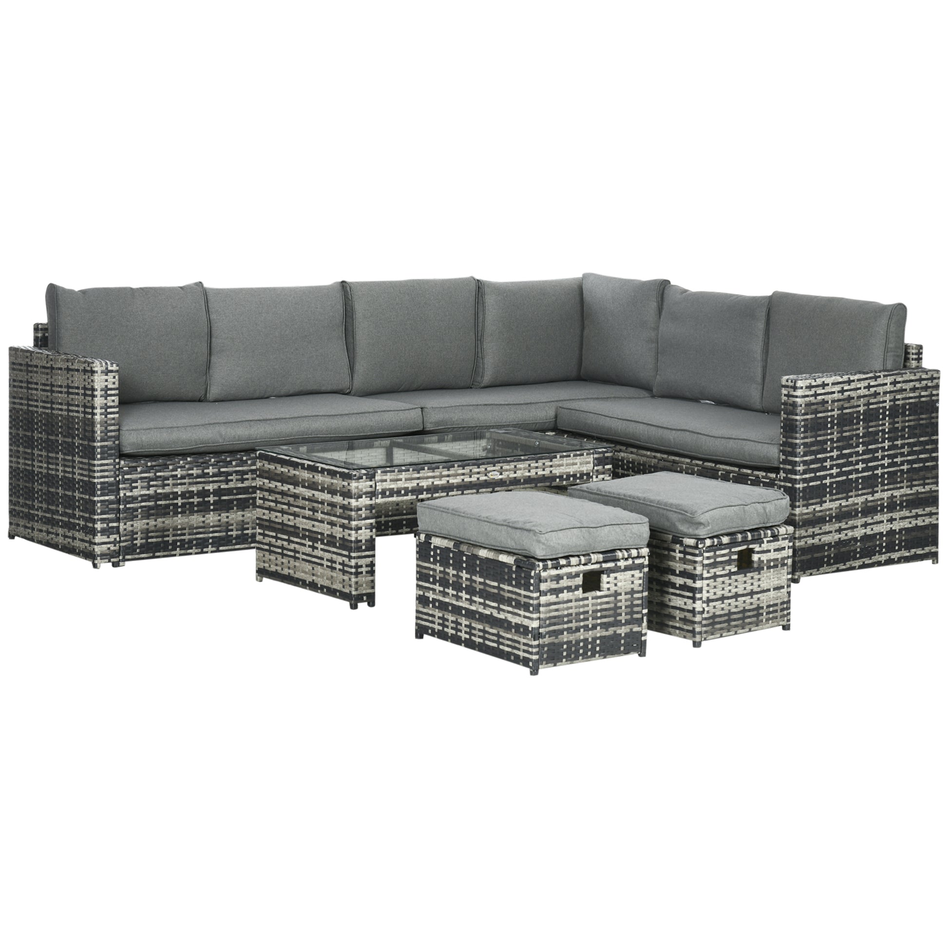 Outsunny 6 Piece Rattan Garden Furniture Set, 8-Seater Outdoor Sofa Sectional with 3 Cushioned Loveseat 2 Footstools Table, Grey