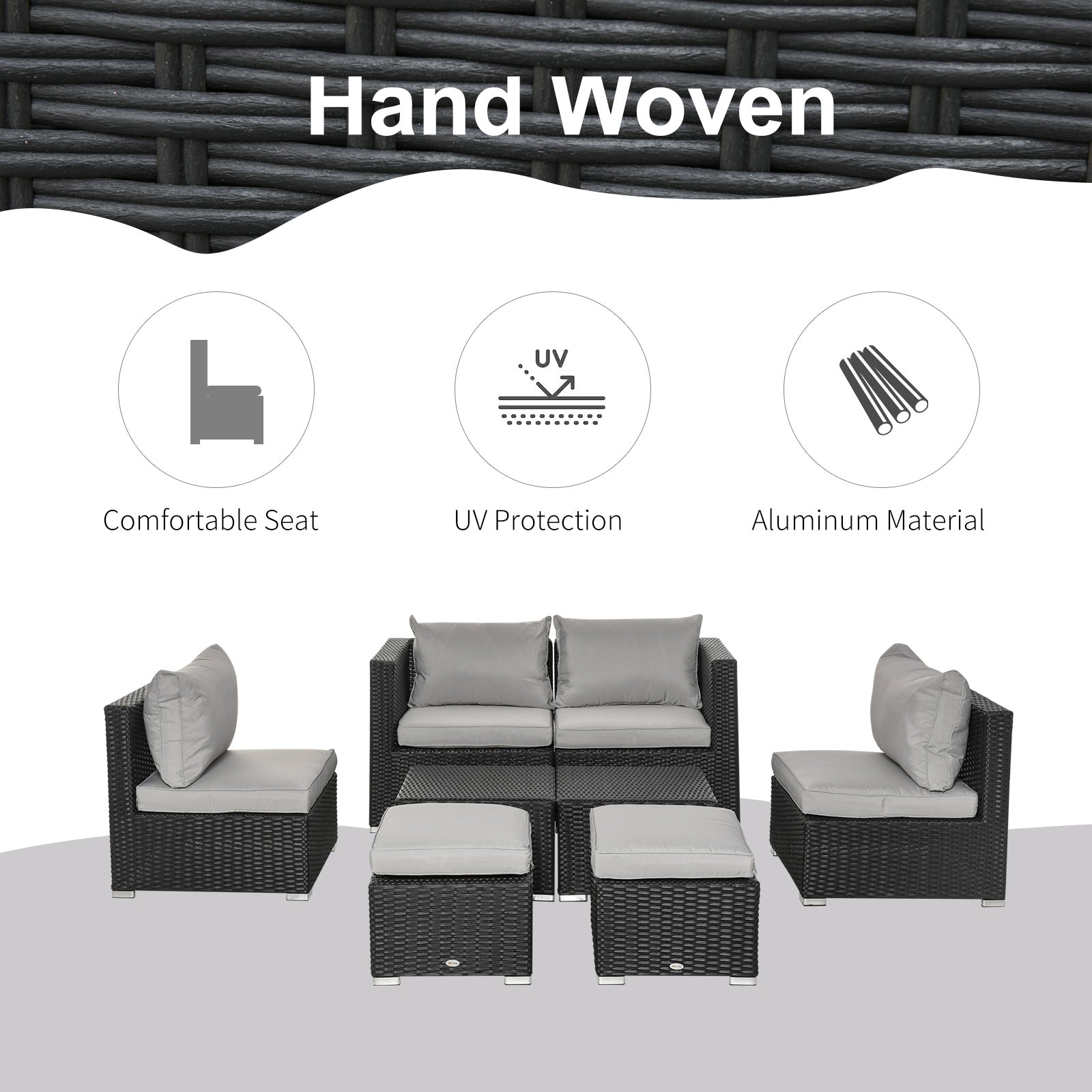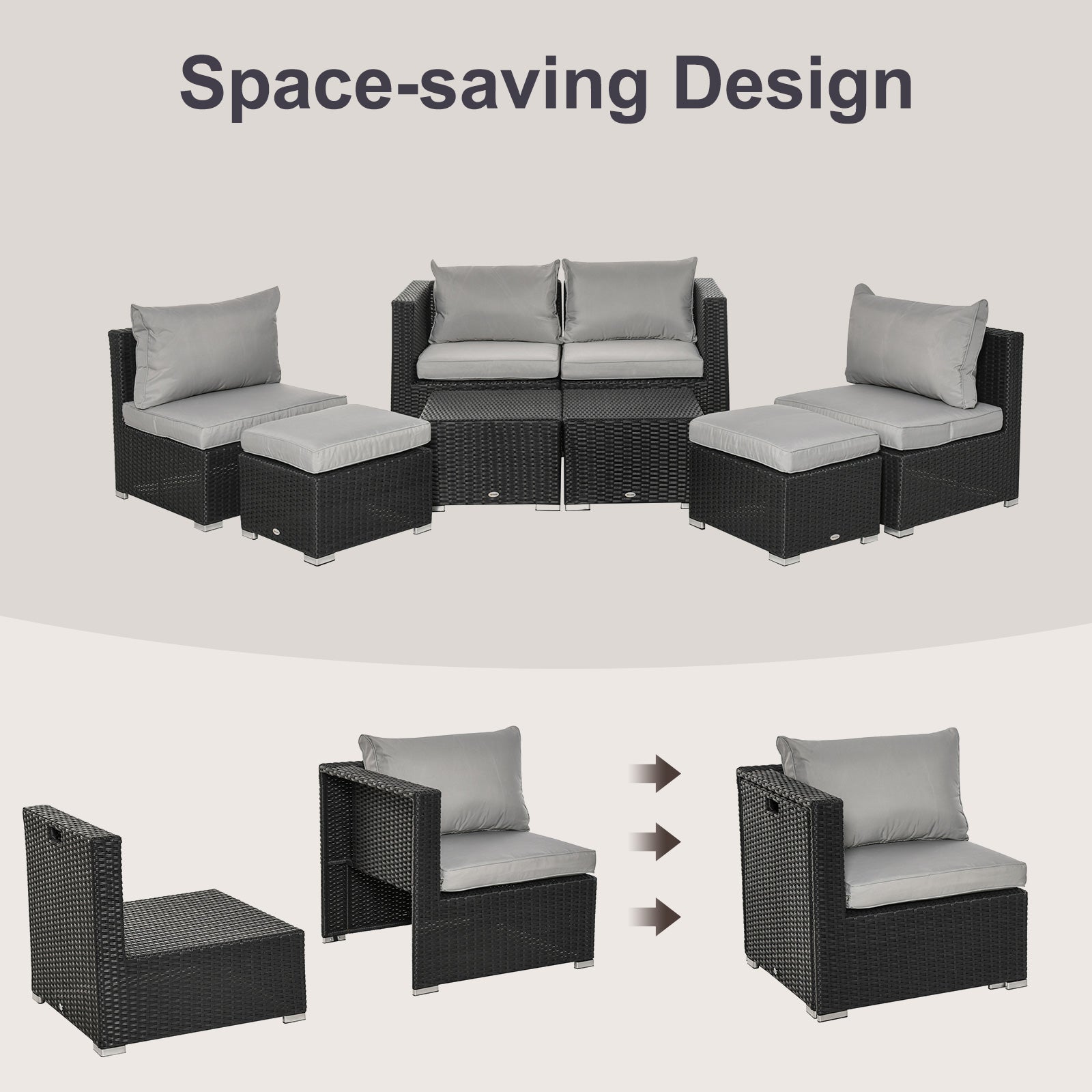 Outsunny 6-Seater Garden Rattan Wicker Sofa Set w/ Coffee Table, Wicker Weave Chair, Space-saving Footstool, Padded Cushions, Black