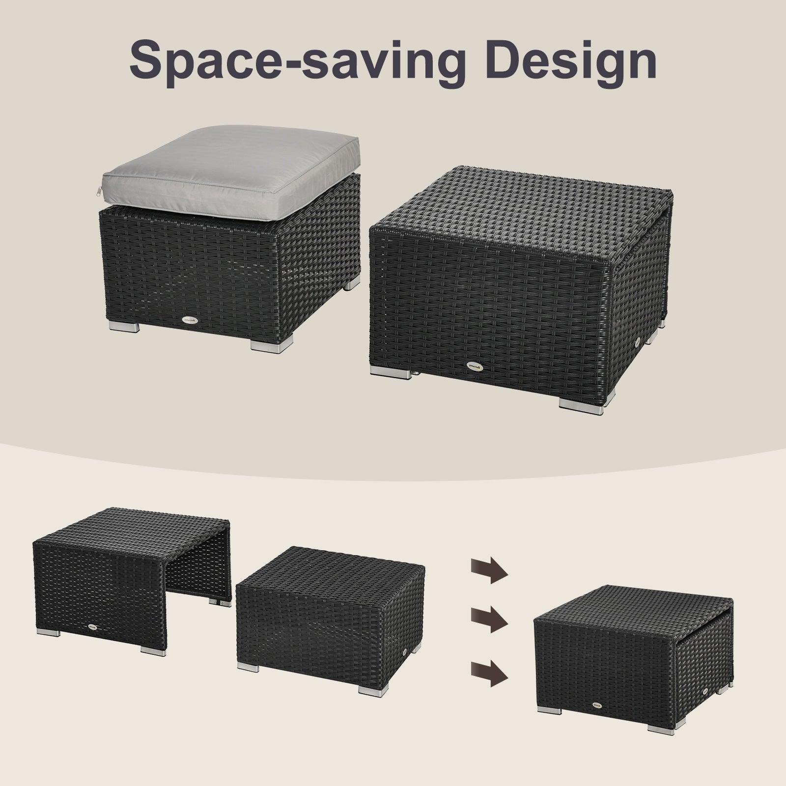 - Footstools fit under the tables, with the single chairs fitting under the corner chairs for space saving