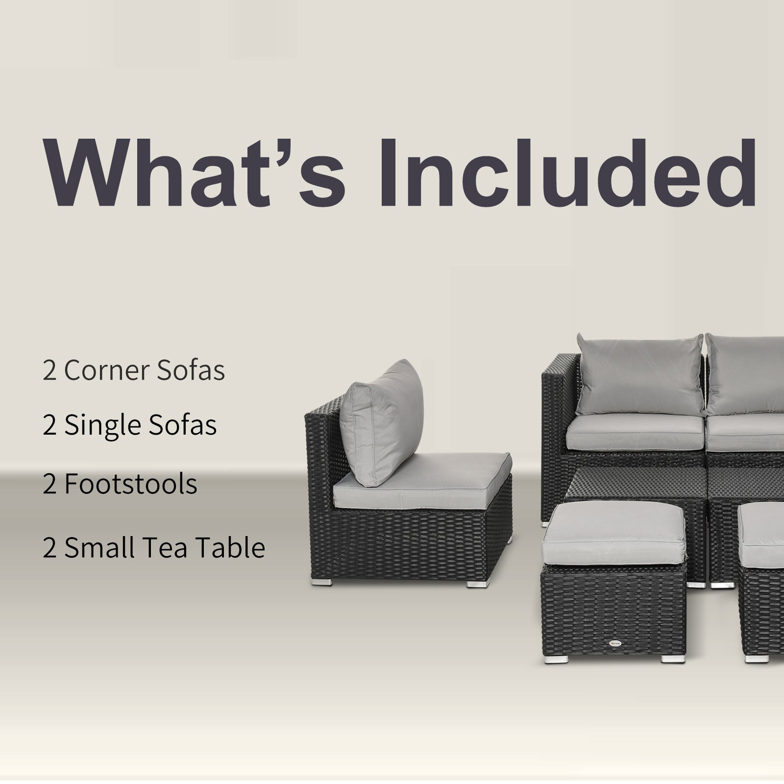 Take comfort to your garden and beyond with this eight-piece outdoor furniture from Outsunny. Using galvanised steel for the frame to ensure a strong and tough structure, each of the two single chairs, two corner chairs, two stools and two coffee tables are covered with PE wicker for long-tern use outdoors, with pieces but the table featuring heavily padded cushions for you to lounge comfortably. A fantastic blend of style, comfort and craftsmanship.