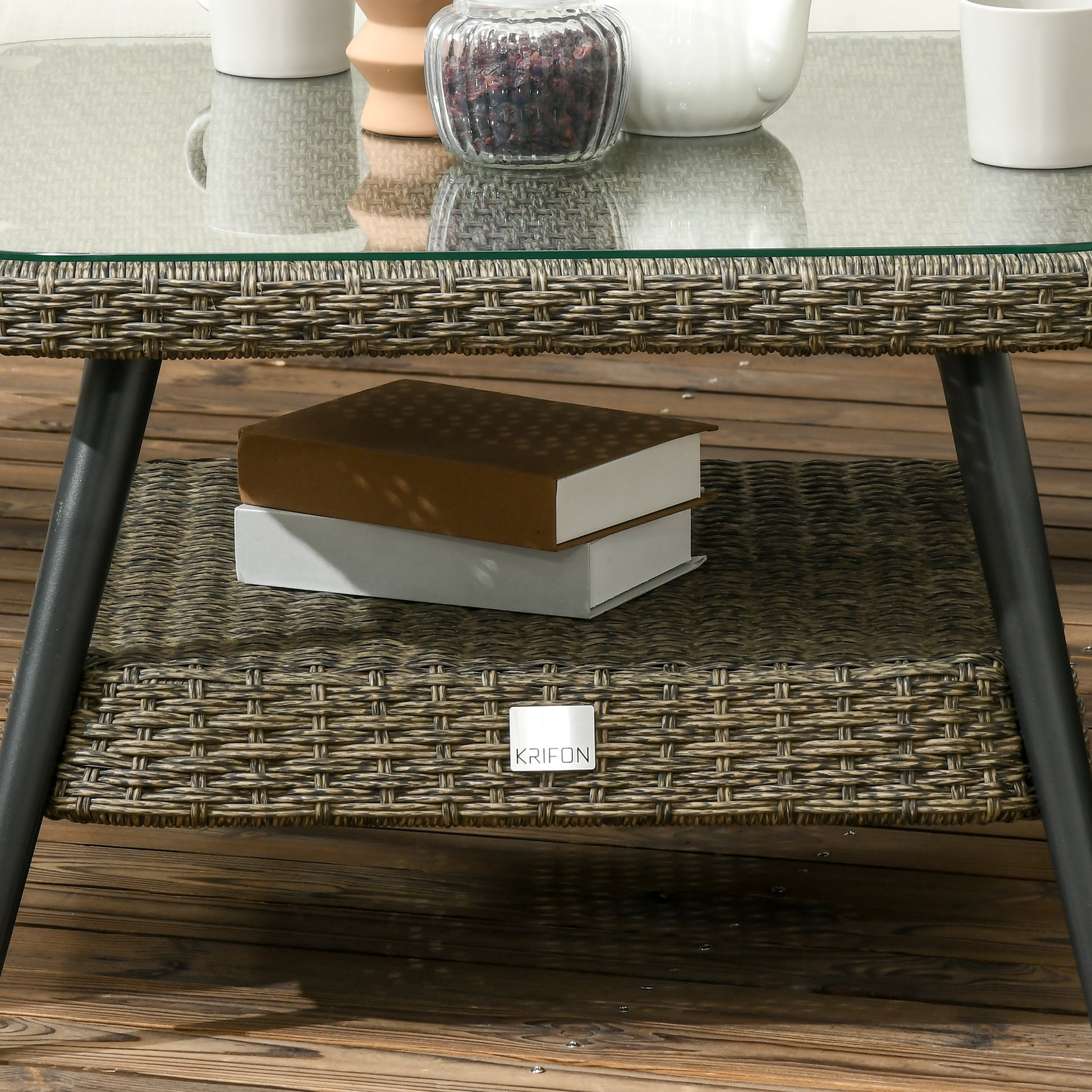 - Glass-top on table for a sleek and safe resting place. Two-tier table for double the holding room