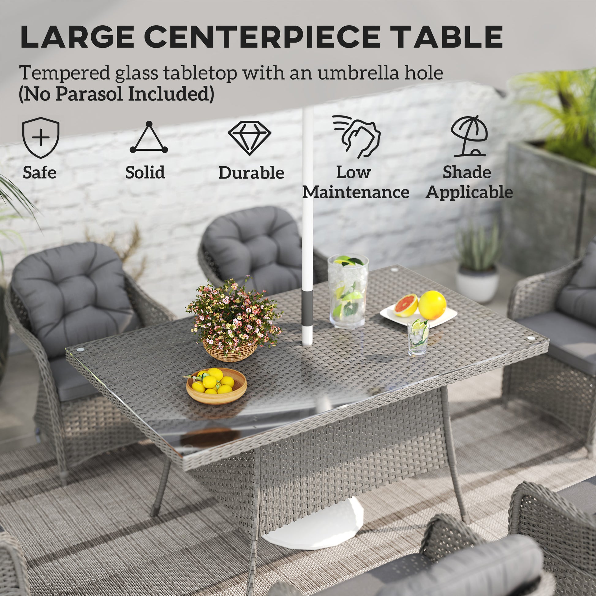 6 Seater Outdoor Garden Furniture Dining Set with Seat and Back Cushions, PE Rattan Table and Chairs, Rectangular Glass Top Table