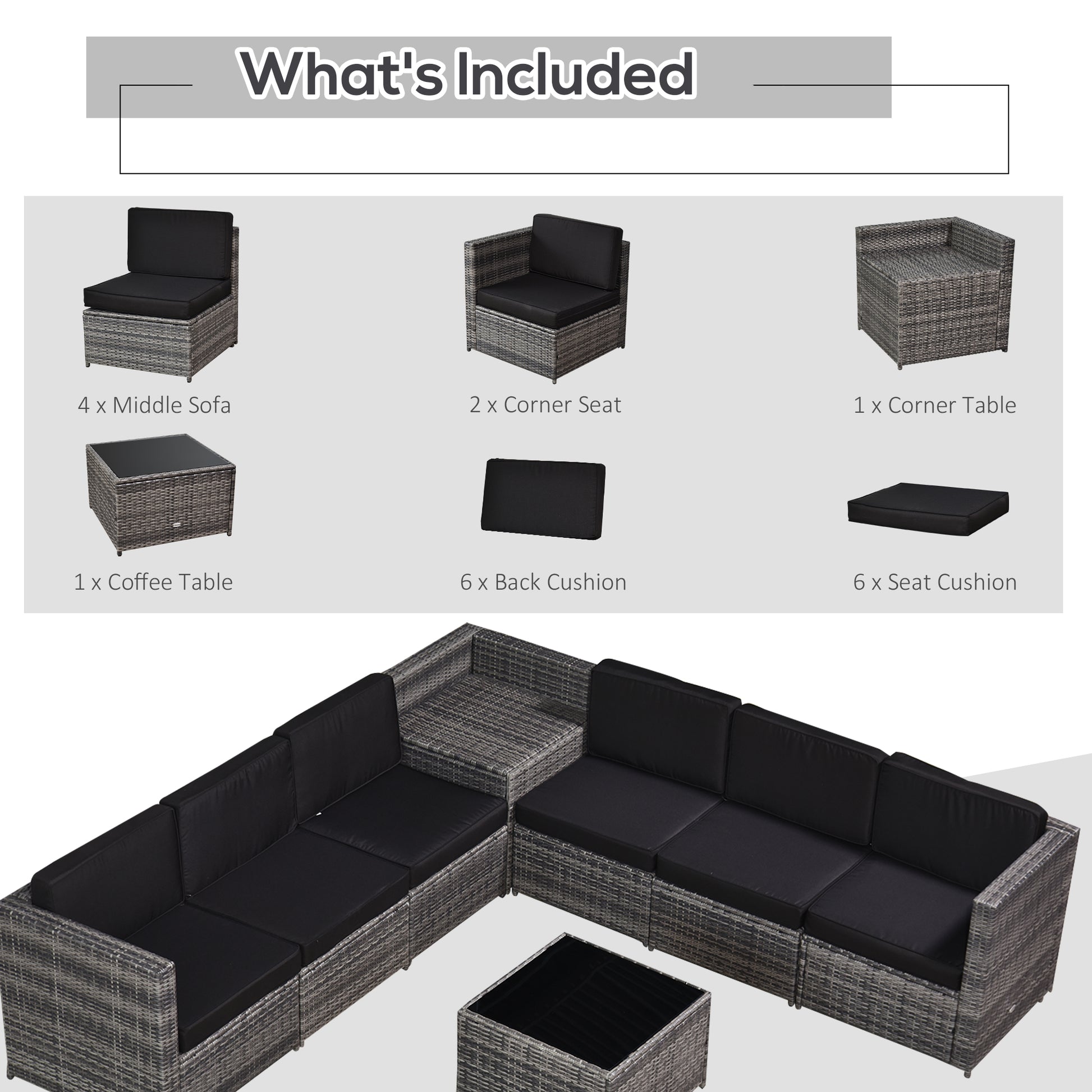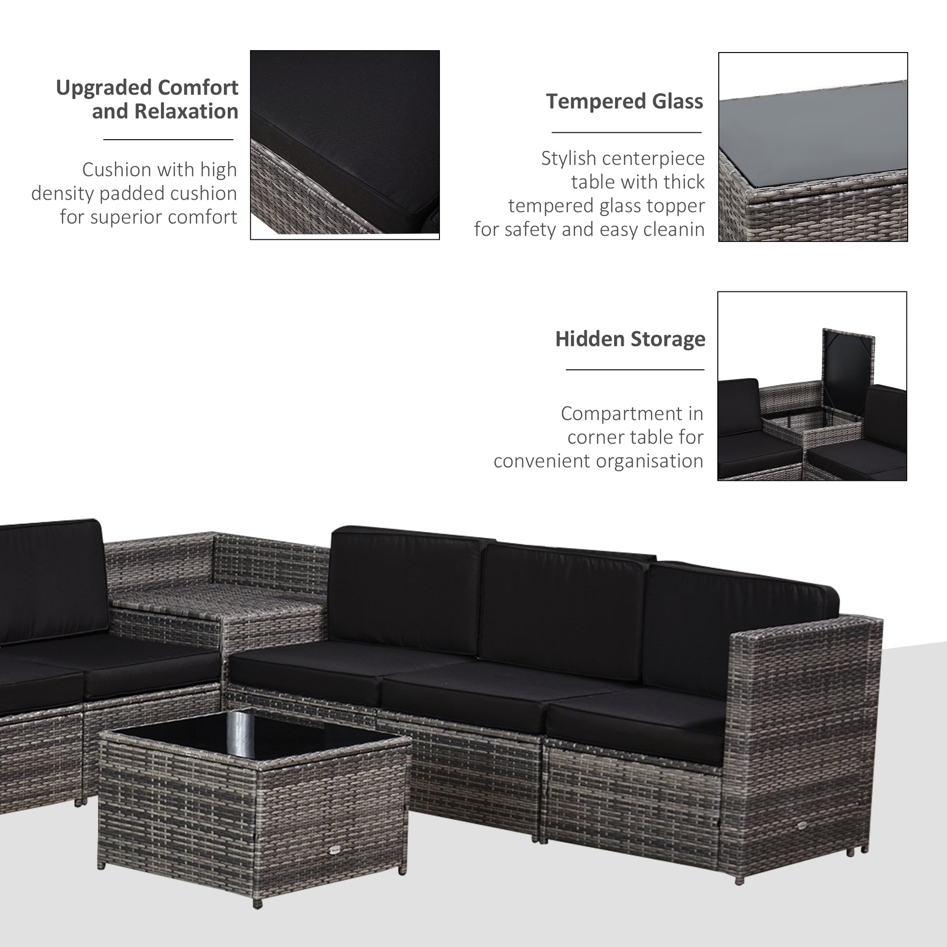 Outsunny 6 Seater Rattan Garden Furniture Patio Rattan Sofa and Table Set with Cushions 8 pcs Corner Wicker Seat Grey