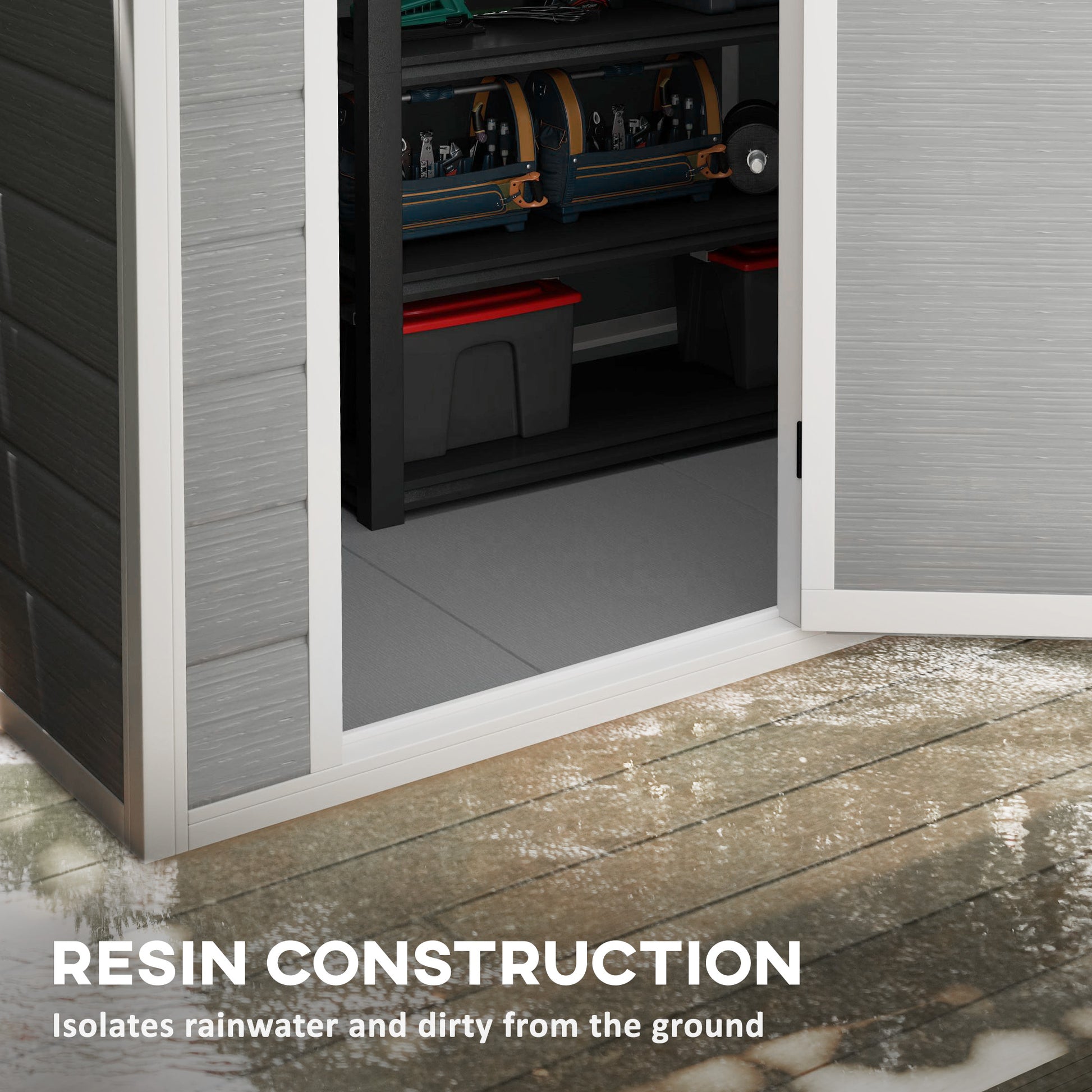 - Integrated floor prevents rainwater seepage, protecting contents