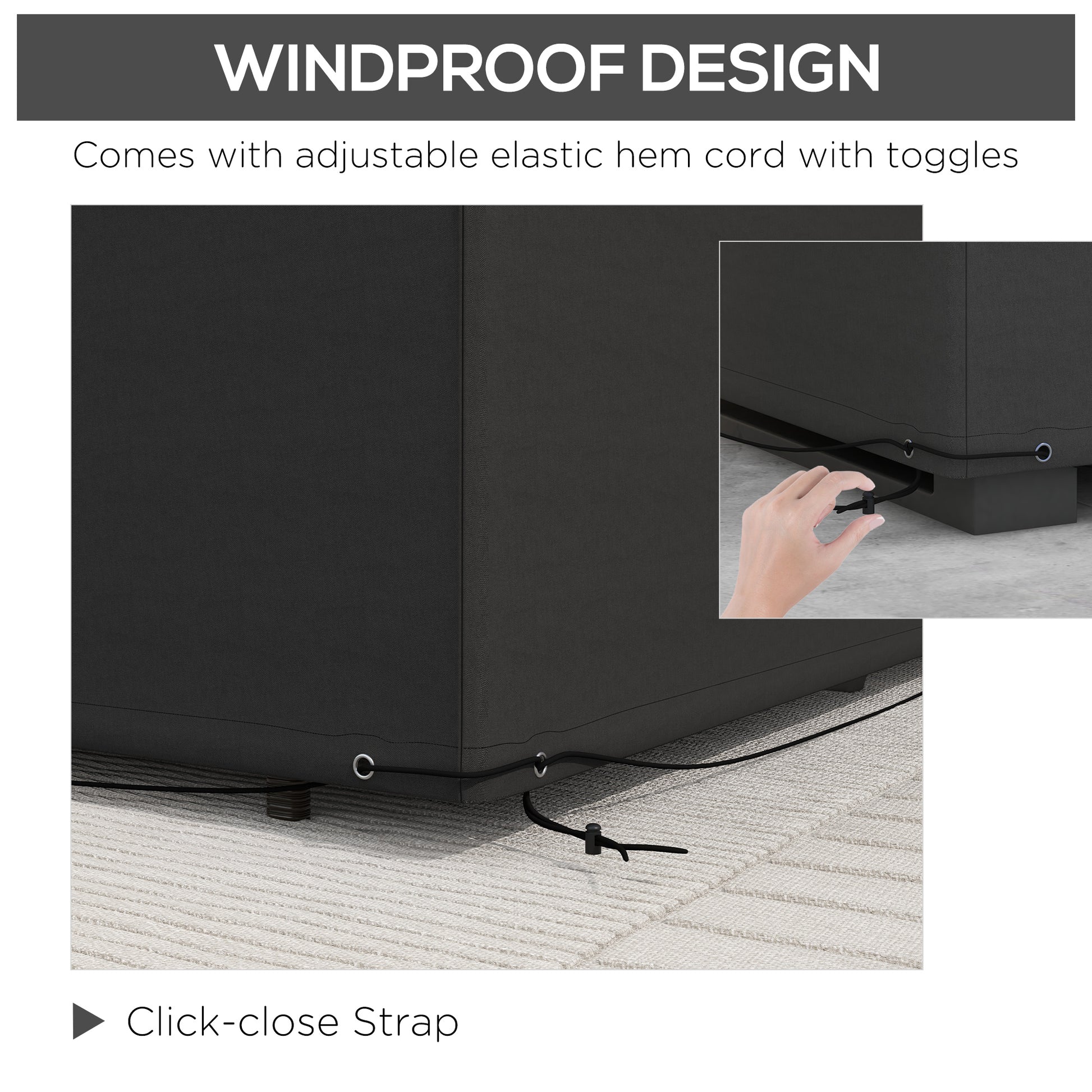 - Drawstring pull cord with weatherproof eyelets and cord lock to hold cover in place